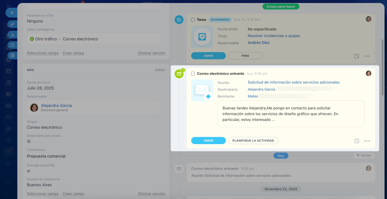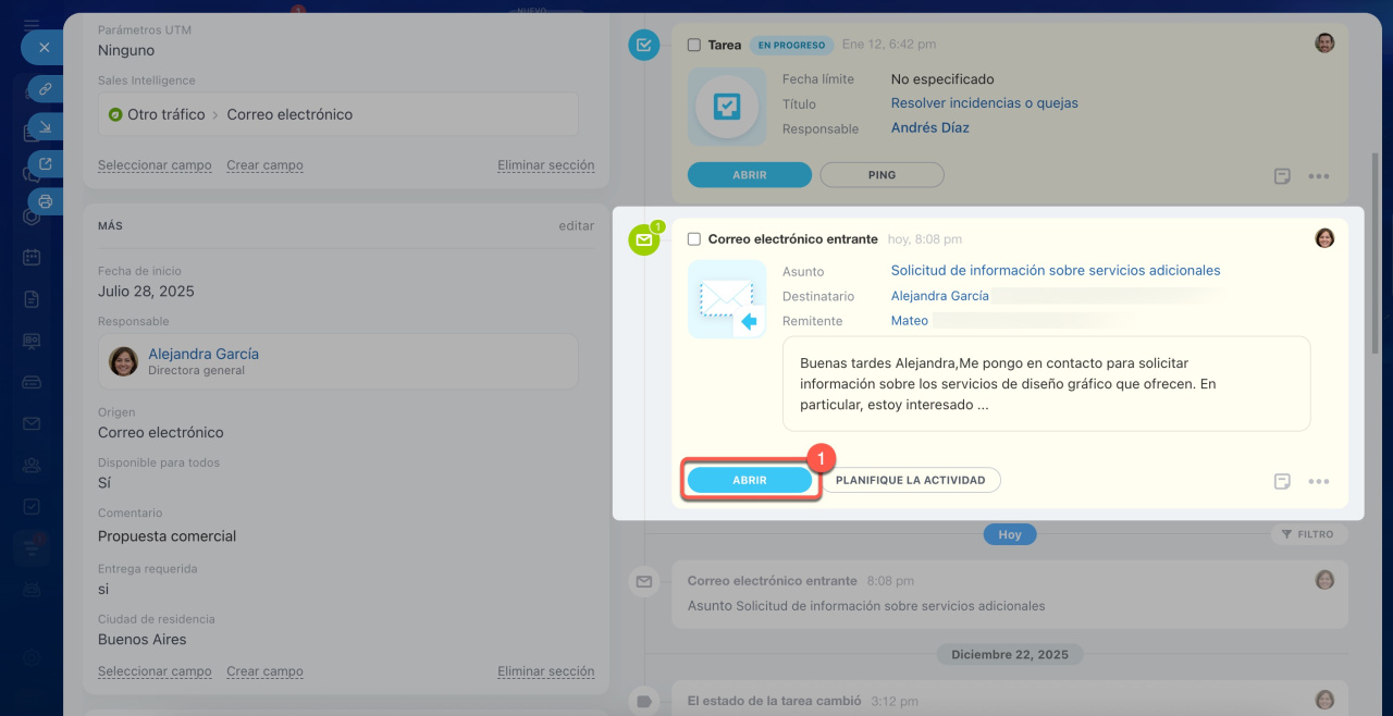 Cuándo se registró el correo en CRM. Consulta el timeline de la ficha del CRM.
