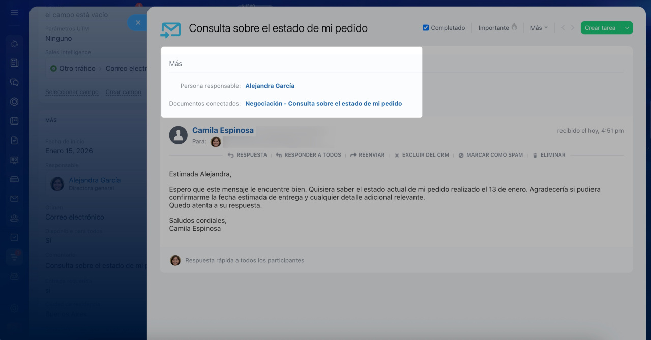 Si en la cola de distribución de prospectos y contactos hay una persona responsable asignada, el nuevo correo de ese cliente se añadirá a su ficha del CRM.