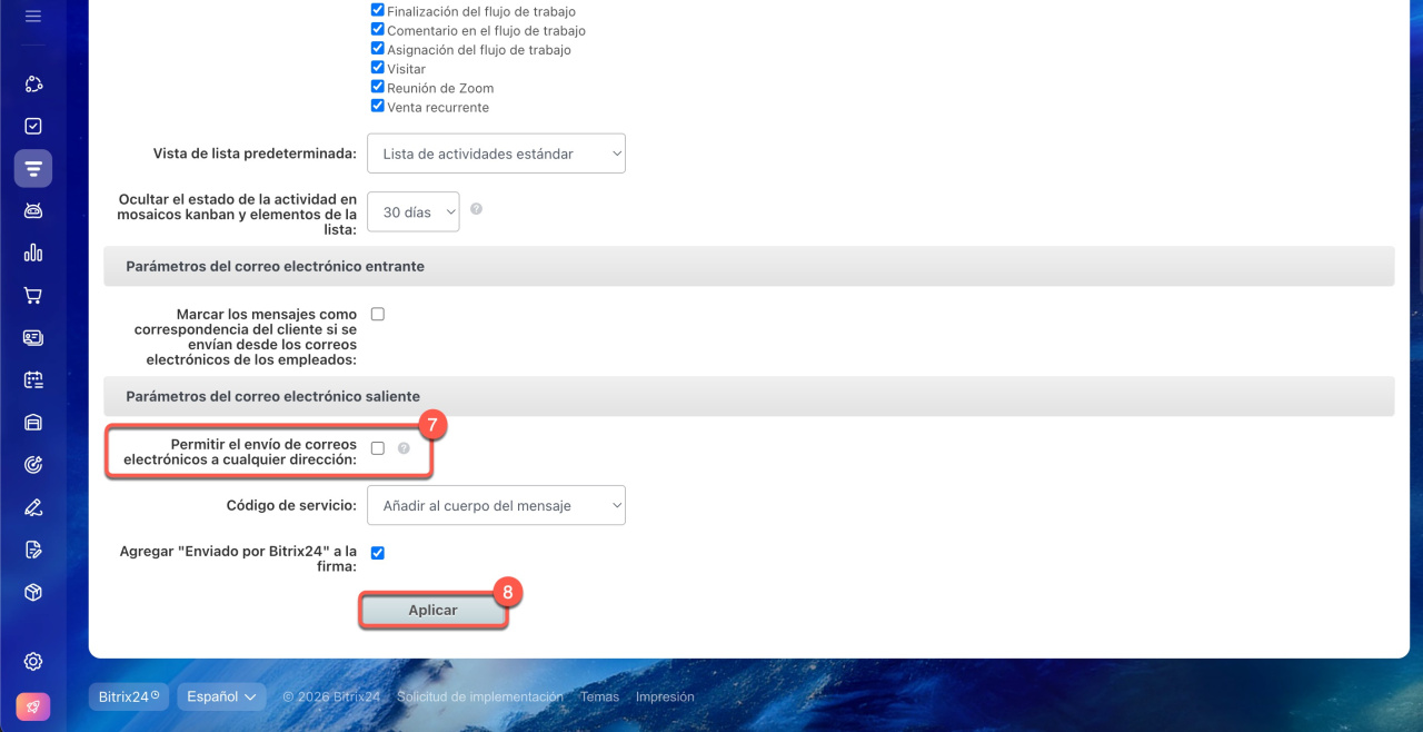 7-8. Desactiva la opción Permitir el envío de correos electrónicos a cualquier dirección y haz clic en Aplicar.