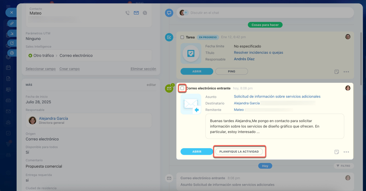 - Crear una nueva actividad a partir del correo: si vas a seguir trabajando con el cliente sobre ese mismo tema.