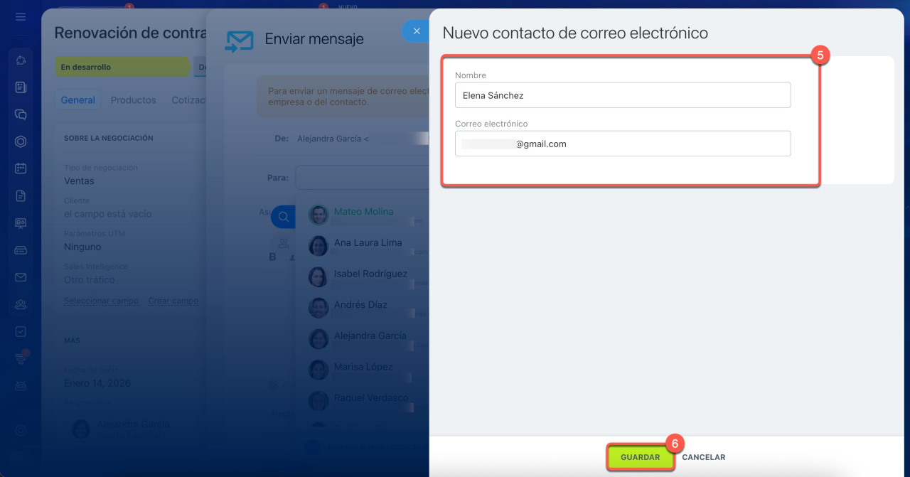 No se crean duplicados si envías un correo a un contacto que ya existe en el CRM, aunque no esté vinculado a la ficha actual.