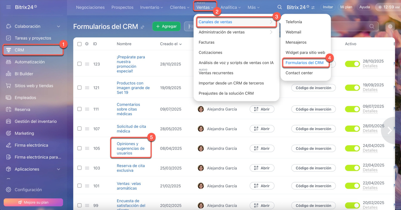 Ve a la sección de CRM > Ventas > Canales de ventas > Formularios del CRM. Abre el formulario del CRM necesario.