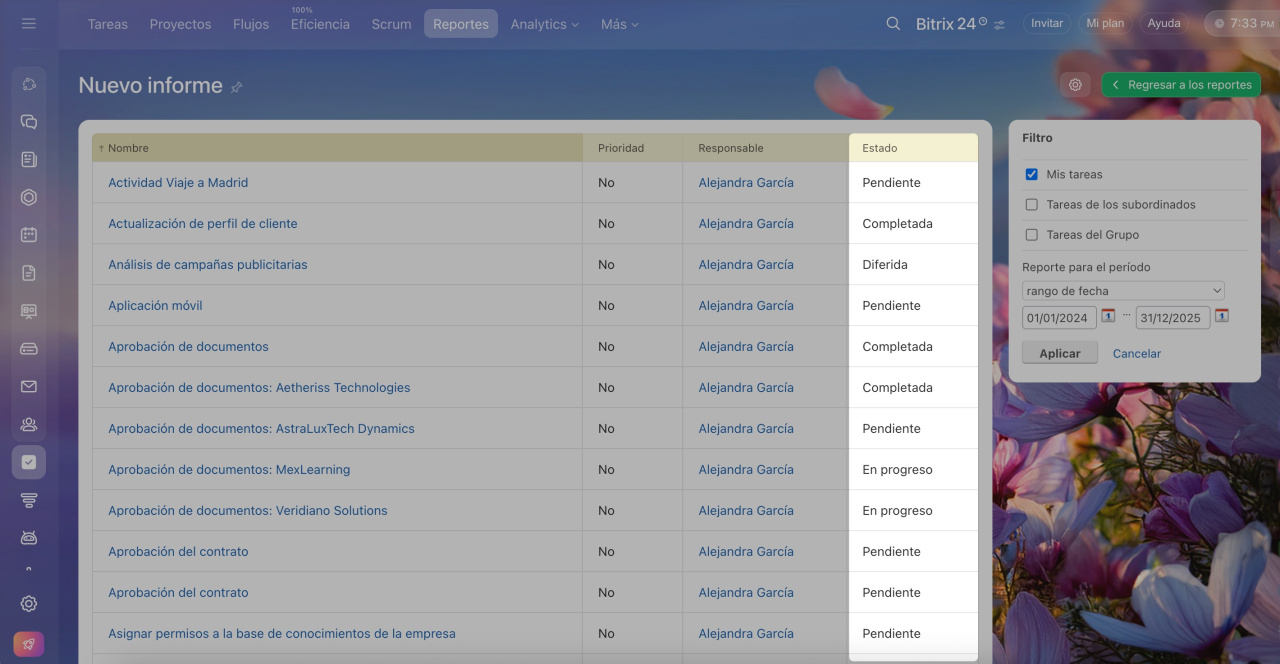 Las tareas en Bitrix24 facilitan la organización del trabajo en equipo, permitiendo asignar tareas y gestionar proyectos grandes. Ayudan a monitorear el progreso de los empleados, controlar los plazos y distribuir responsabilidades.
