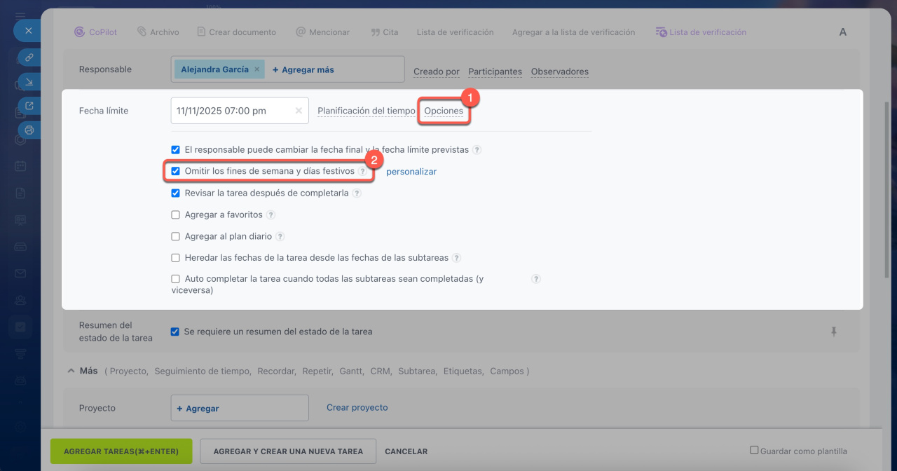 En las tareas recurrentes, la fecha límite se calcula desde la fecha de creación. Si la opción Omitir los fines de semana y días festivos está habilitada en la plantilla, se consideran las horas laborales establecidas en la configuración de Bitrix24.