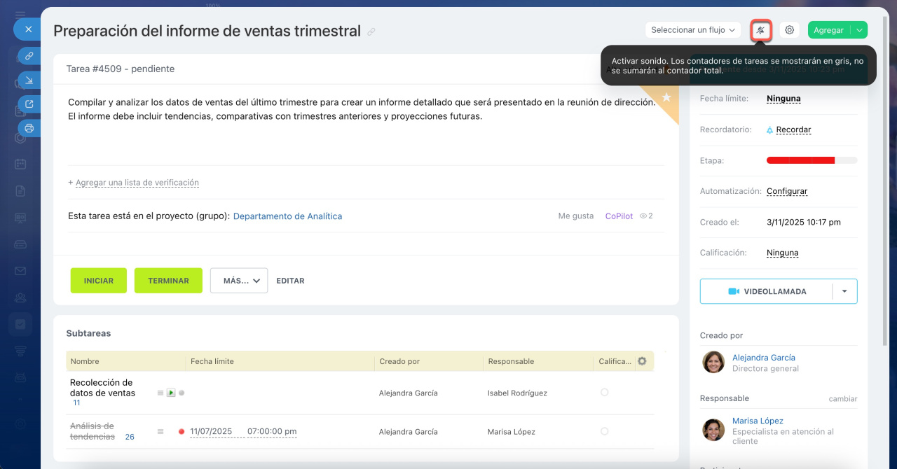 Si quieres activar las notificaciones, abre la tarea correspondiente y haz clic en el icono de la campana.