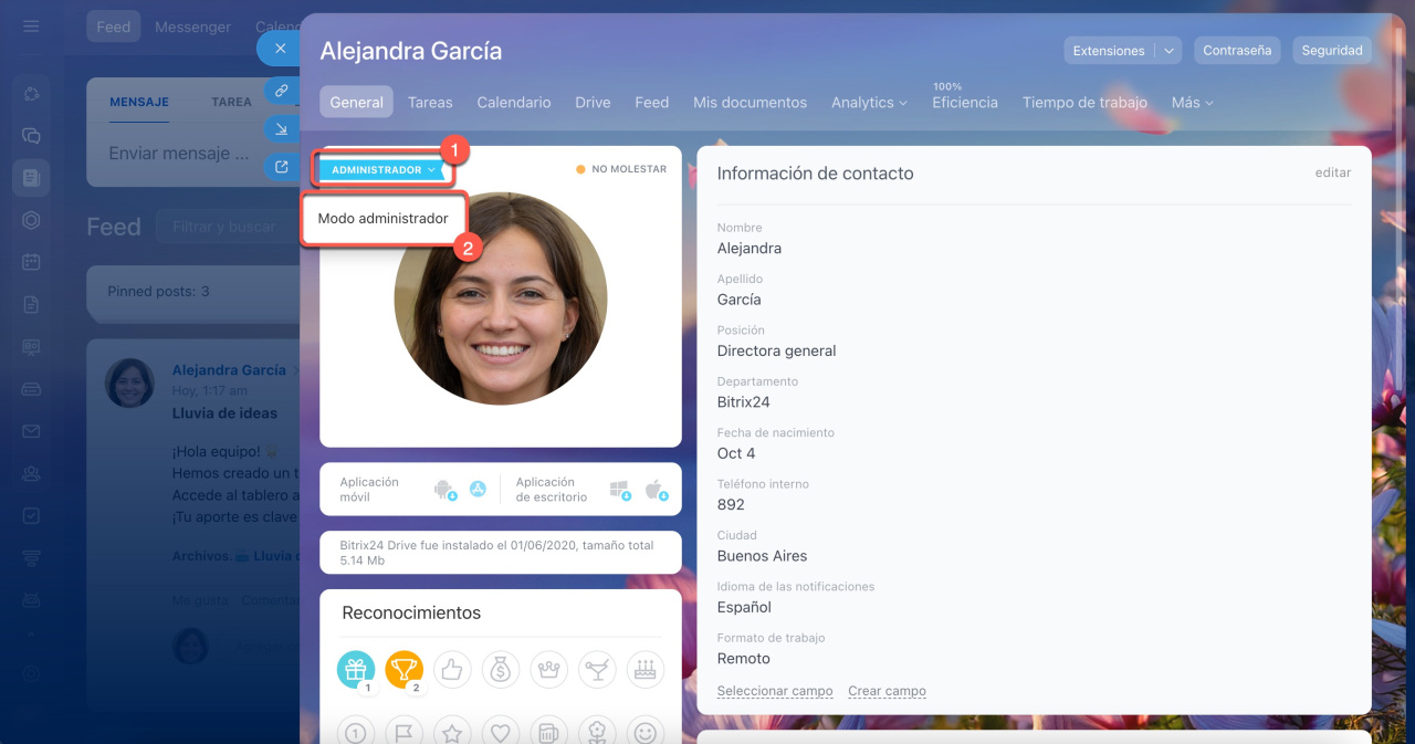 Abre tu perfil y haz clic en Administrador > Modo administrador.