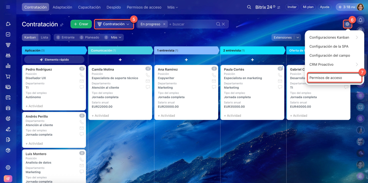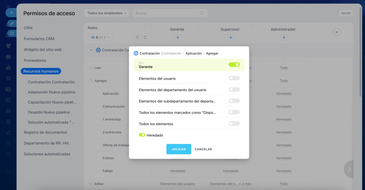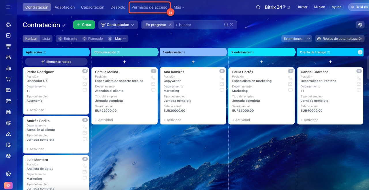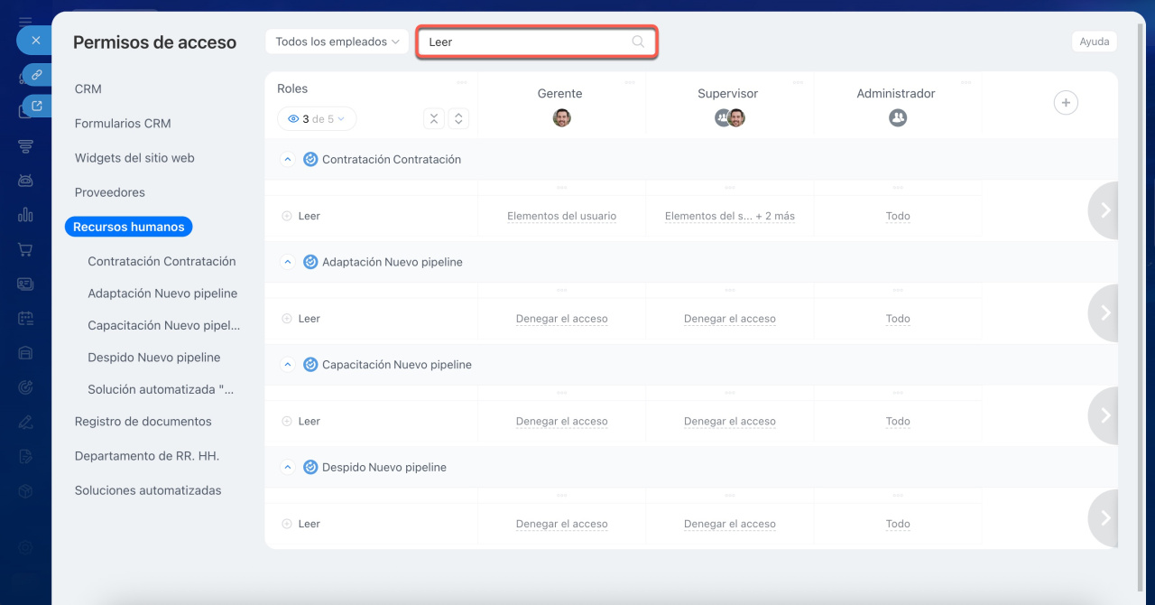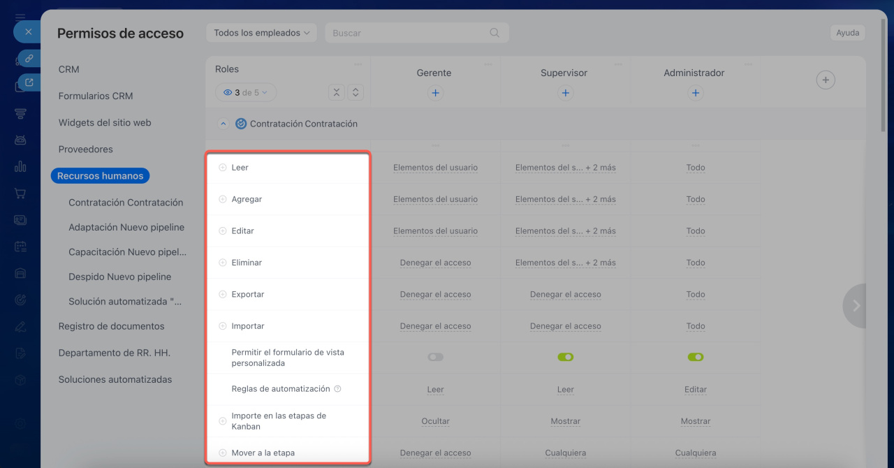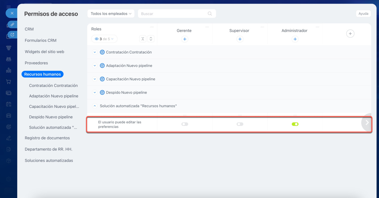 En Bitrix24, ahora puedes configurar los permisos de acceso para las soluciones automatizadas. Puedes asignar roles con diferentes permisos a departamentos y empleados. Por ejemplo, el departamento de RR. HH. podría tener acceso completo a la solución automatizada de contratación, mientras que los directivos solo tendrían permisos de visualización.