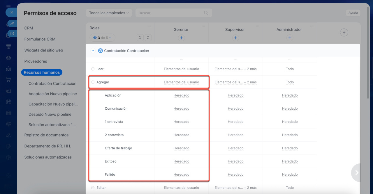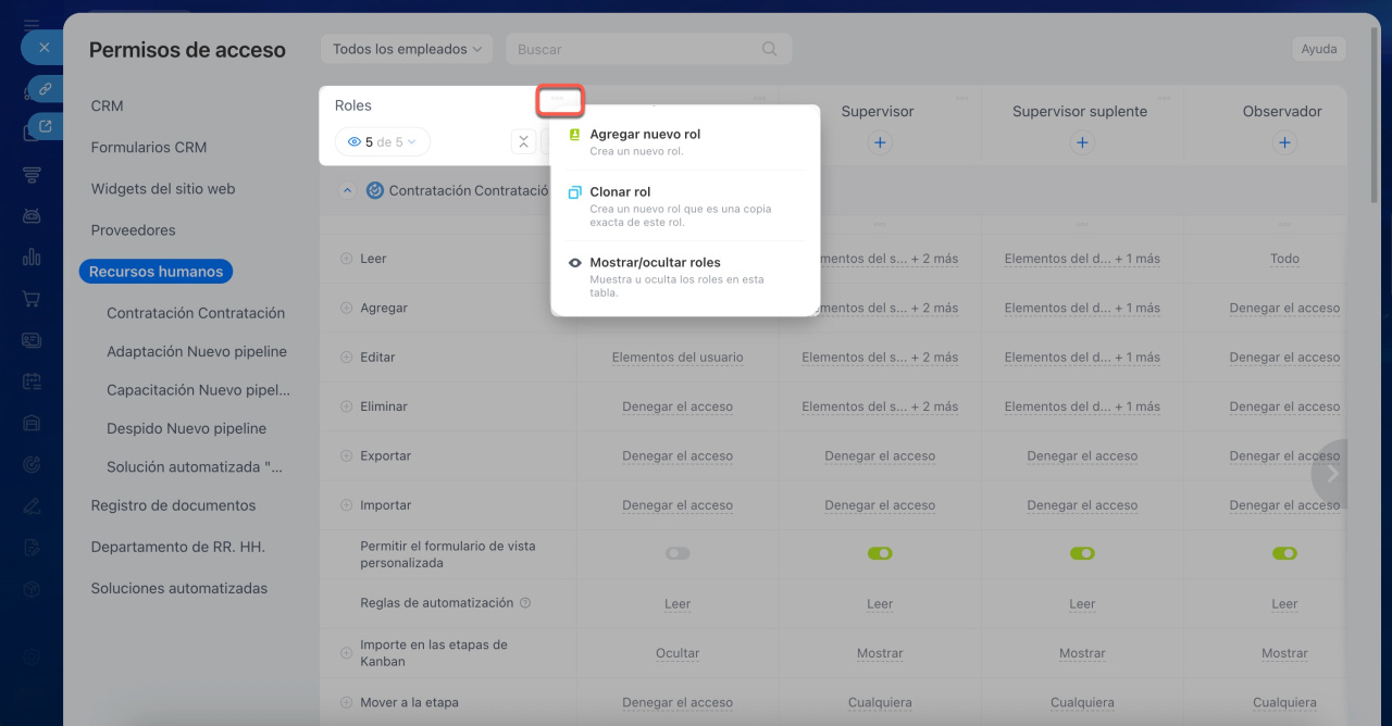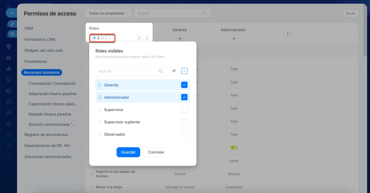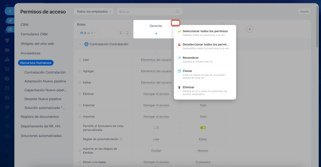- Para configurar los permisos de acceso, selecciona o crea un rol, personalízalo según las necesidades, asigna el rol a los empleados correspondientes y especifica el nivel de acceso para cada rol.
