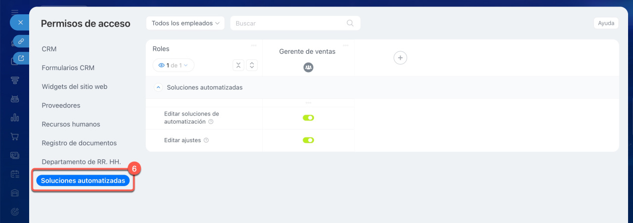 - Selecciona Soluciones automatizadas e indica los empleados que podrán crear y configurar soluciones automatizadas.
