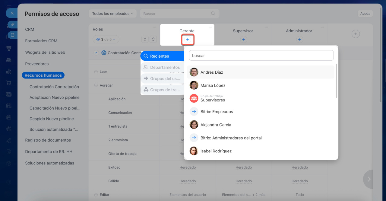 Haz clic en Plus (+) bajo el rol deseado y selecciona un empleado, departamento o grupo. Por ejemplo, un supervisor podrá editar y eliminar los elementos del proceso inteligente, mientras que los gerentes solo podrán verlos.