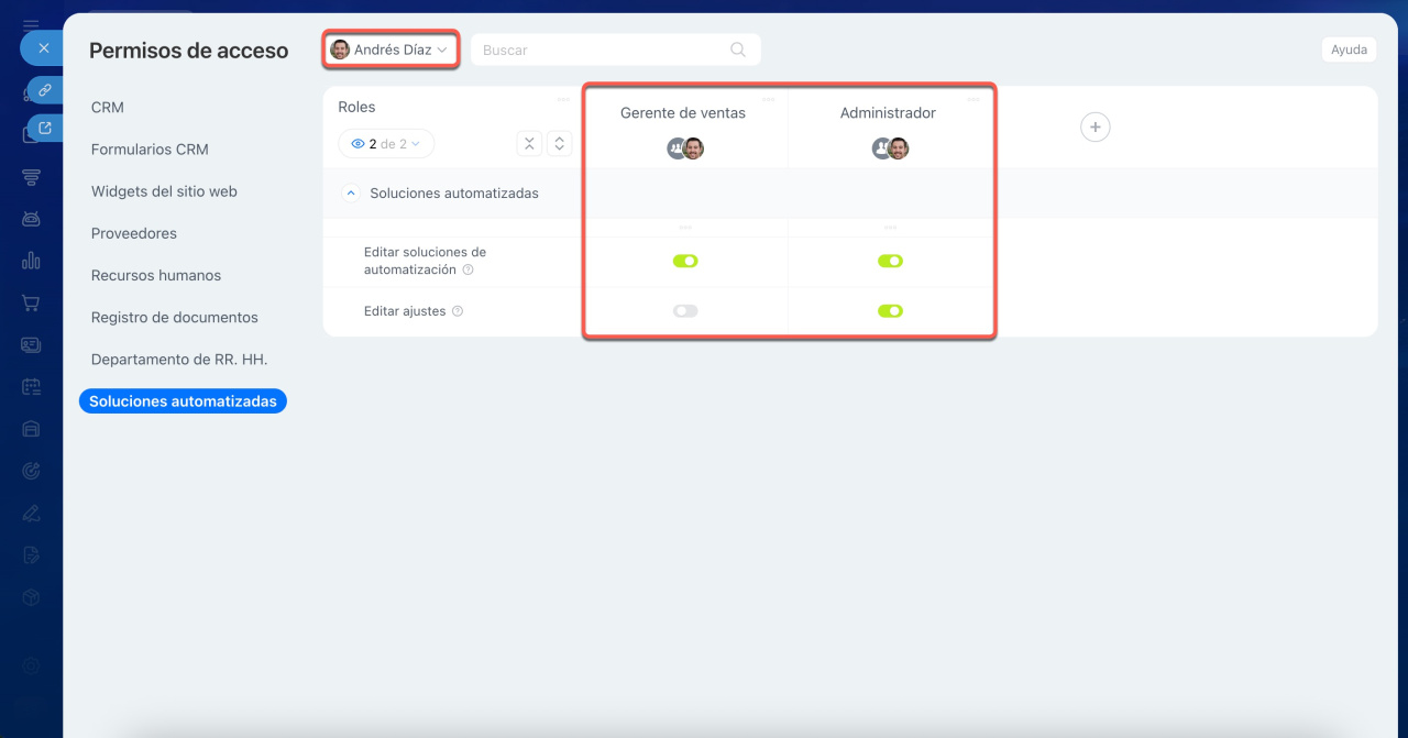 Ficha de CRM: características y configuraciones - Reglas de automatización: configurar, modificar o ver reglas de automatización. Este permiso estará disponible si las reglas de automatización están habilitadas en la configuración del proceso inteligente.