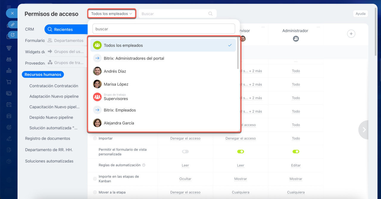 El administrador de Bitrix24 puede configurar los permisos de acceso y también delegar esta tarea a otros empleados.