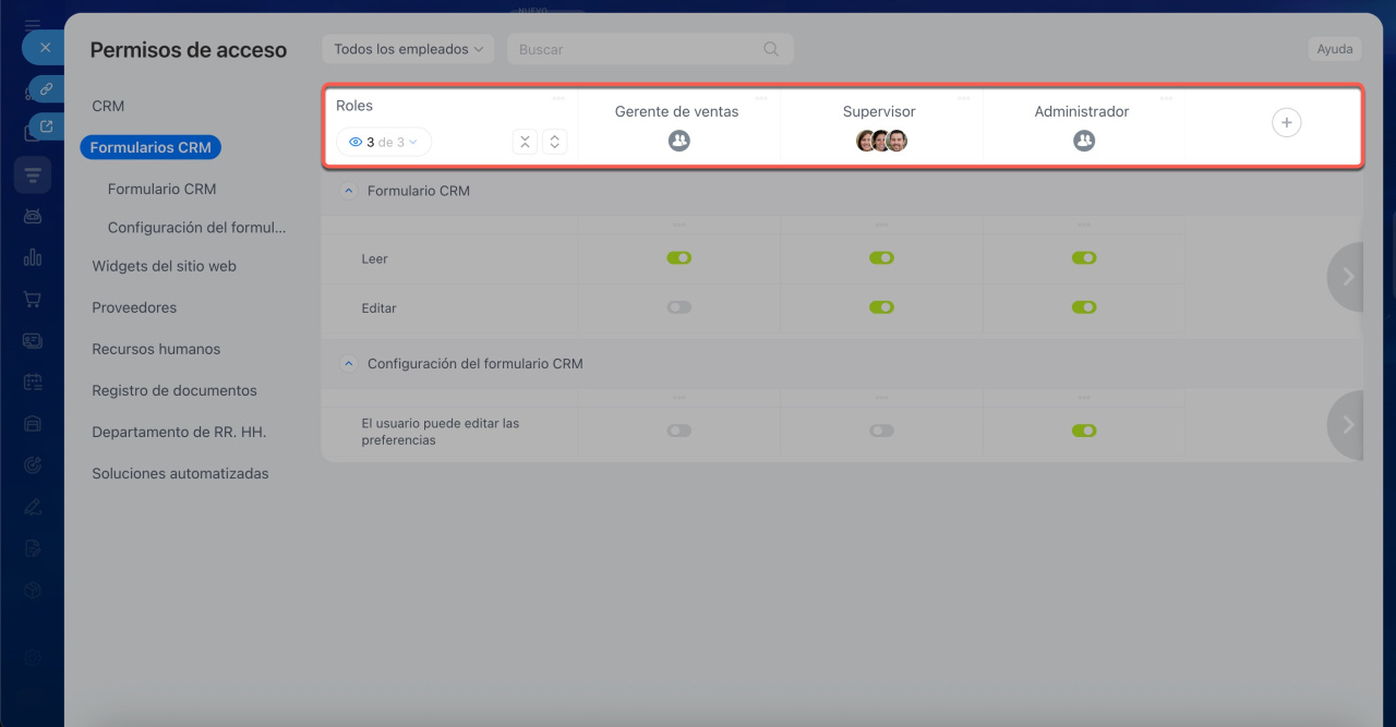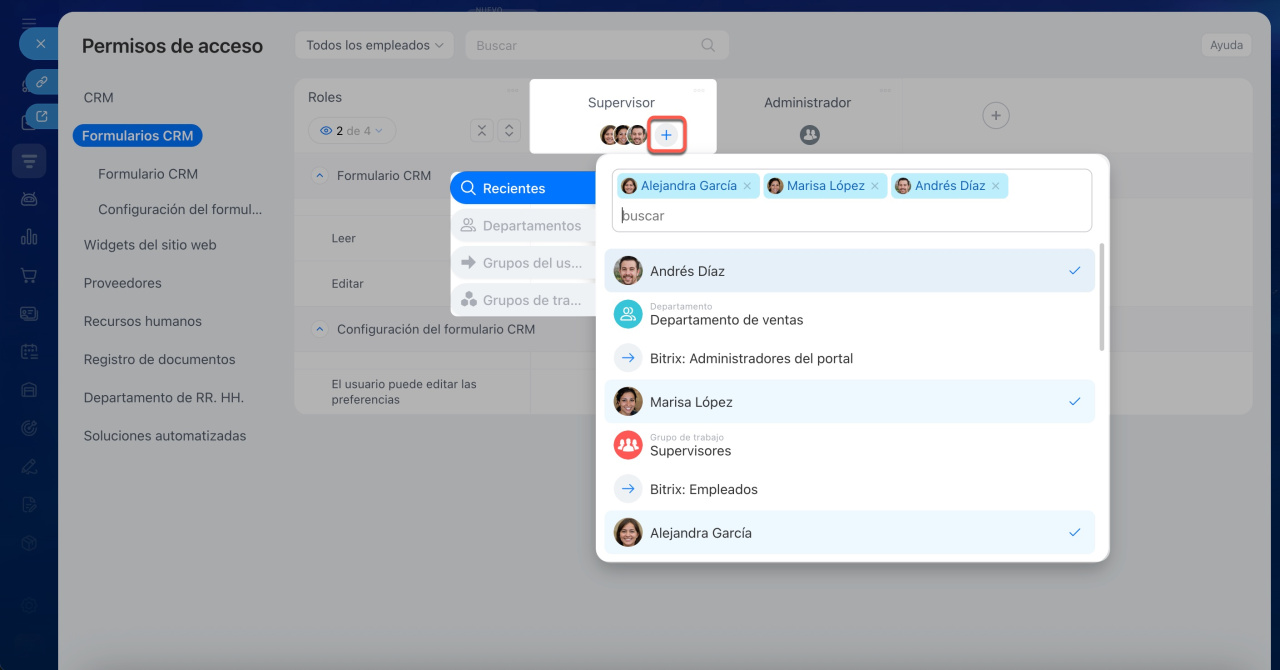 Haz clic en Plus (+) bajo el rol deseado y selecciona un empleado, departamento o grupo. Por ejemplo, un supervisor podrá editar los formularios de CRM, mientras que los gerentes solo podrán verlos.