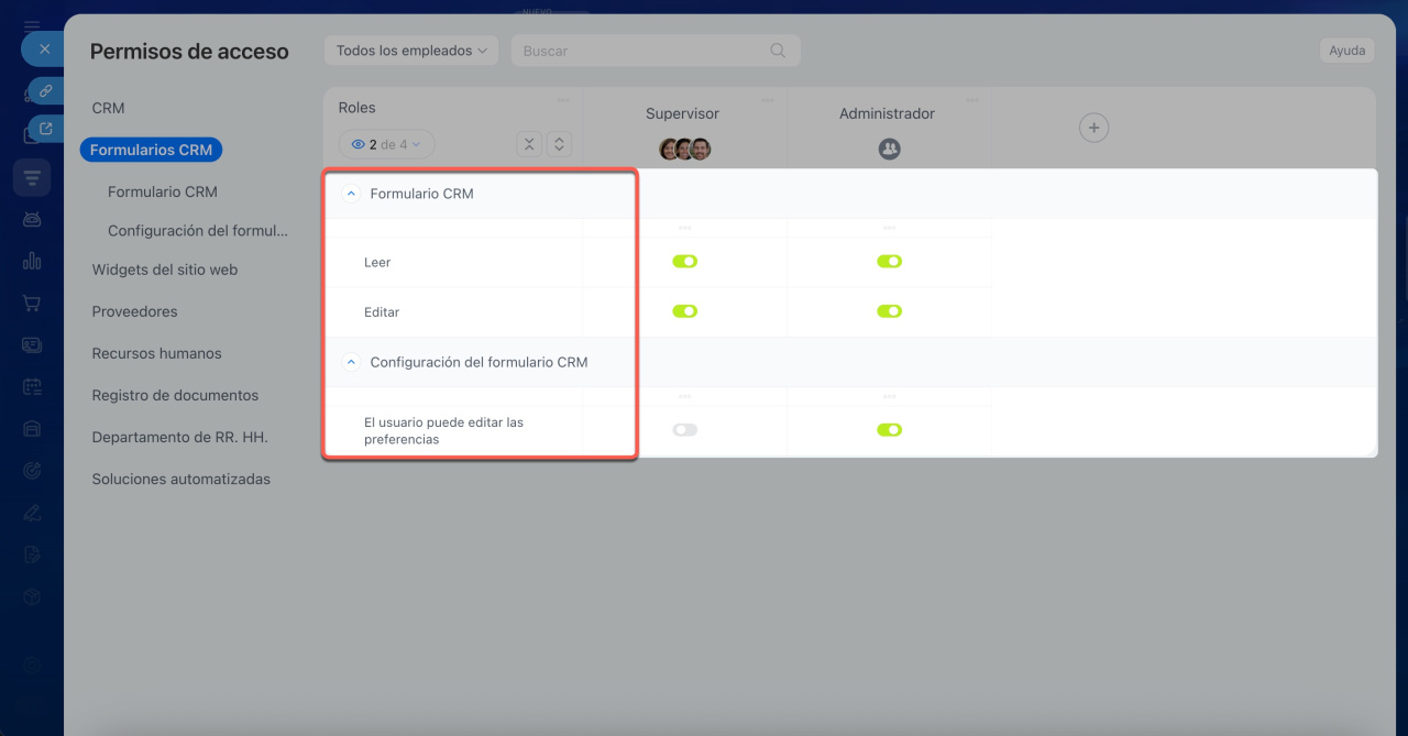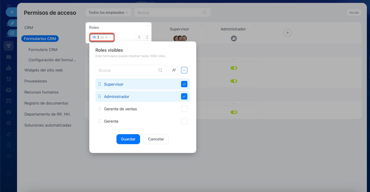 - Si se han creado roles adicionales en la configuración de permisos de CRM, estos se trasladarán automáticamente a los permisos de los formularios.