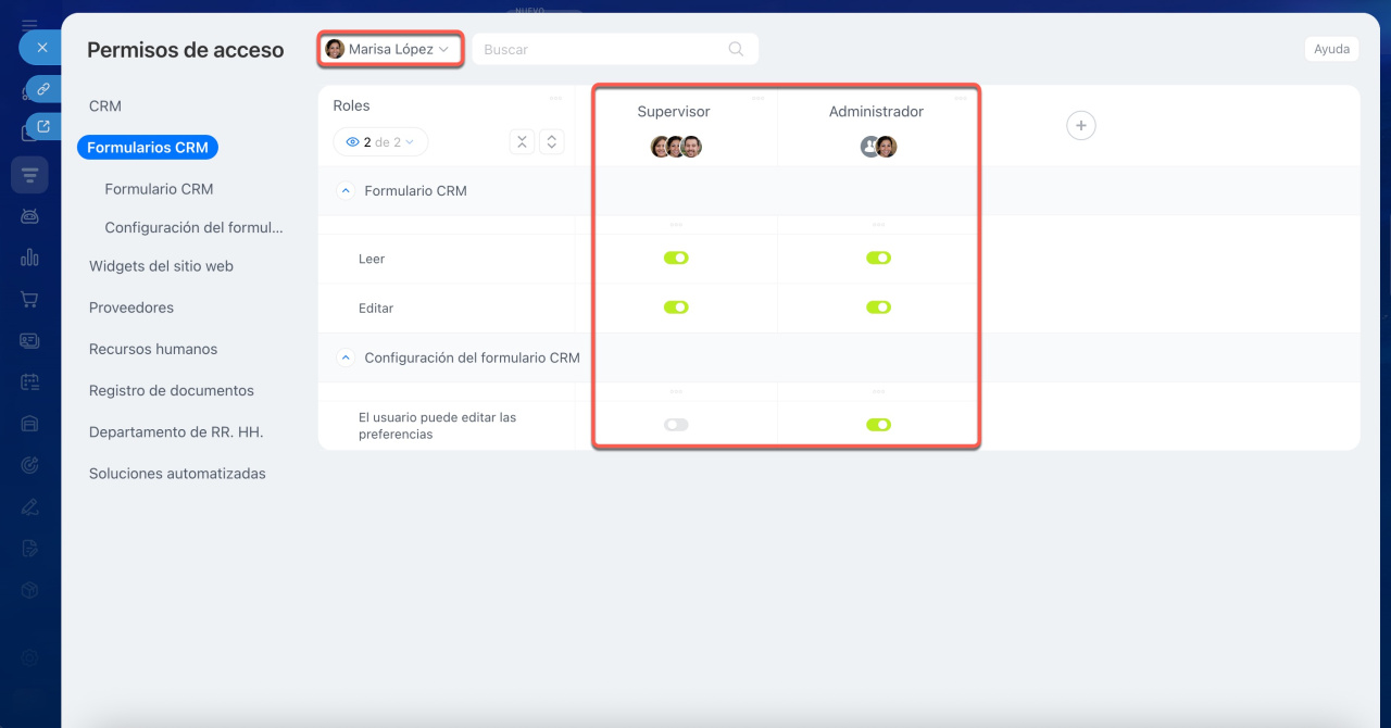 - El usuario puede editar las preferencias: otorga el acceso completo para cambiar configuraciones y permisos de acceso a los formularios de CRM.