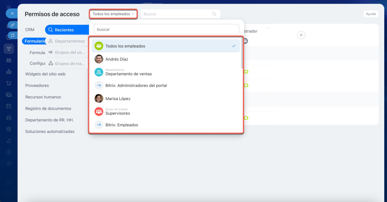 El administrador de Bitrix24 puede ajustar los permisos de acceso y también delegar esta tarea a otros empleados.