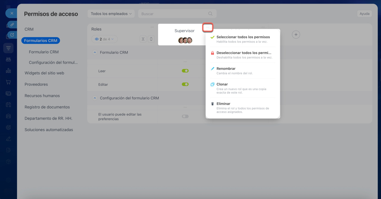 - Deseleccionar todos los permisos: restringe el acceso a todos los formularios de CRM.