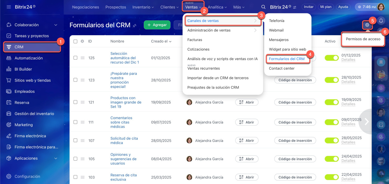 - En Bitrix24, ahora puedes ajustar los permisos de acceso para los formularios de CRM. Esto te permite decidir quién puede ver, crear y modificar los formularios.