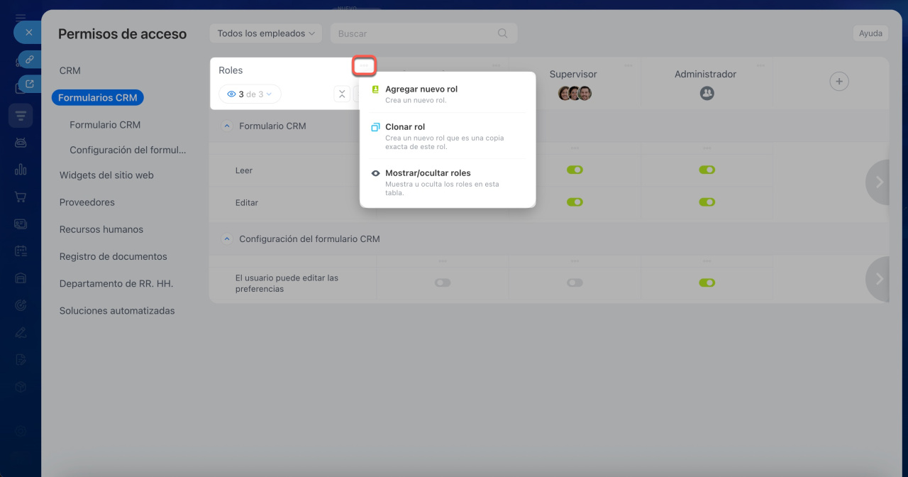 Configurar un rol específico. Haz clic en Tres puntos (...) a la derecha del nombre del rol y elige la acción apropiada: