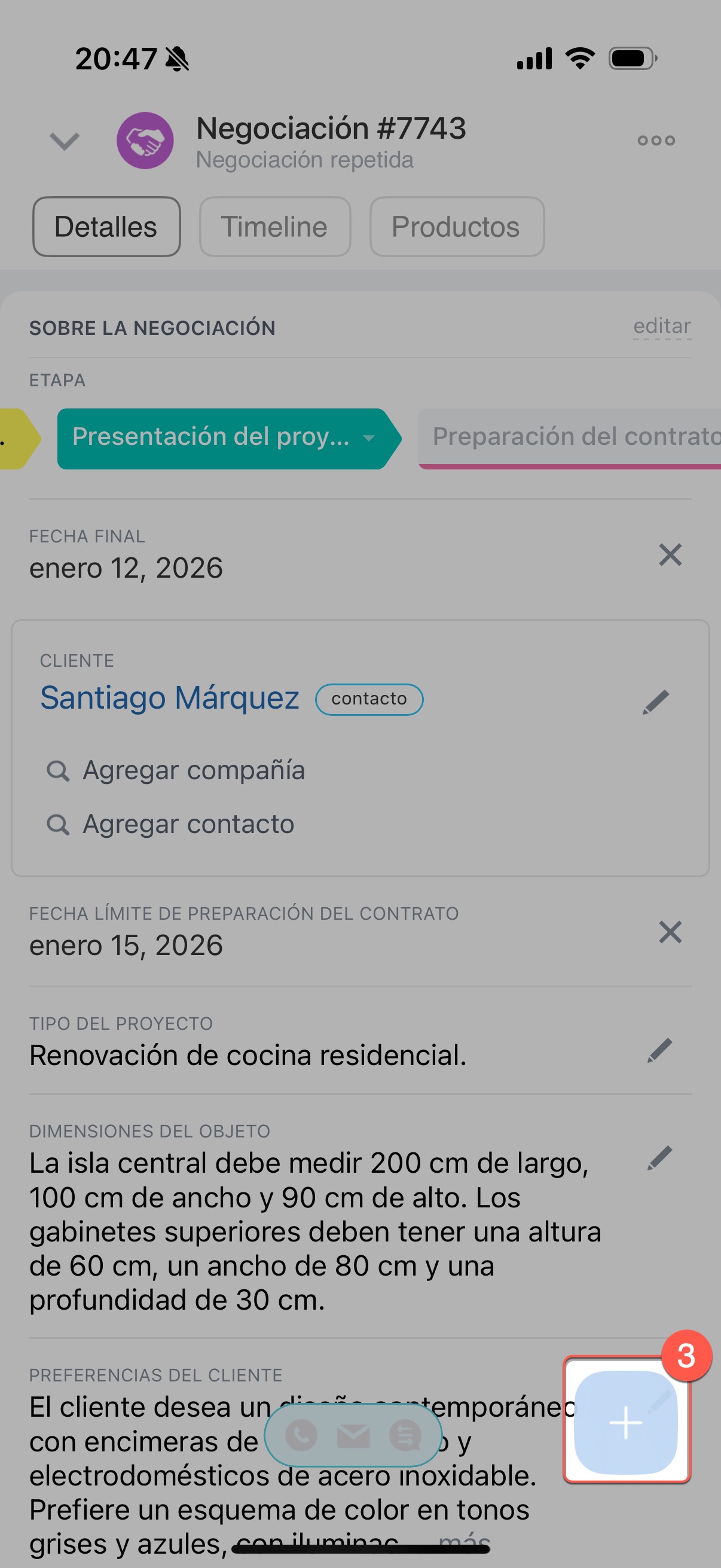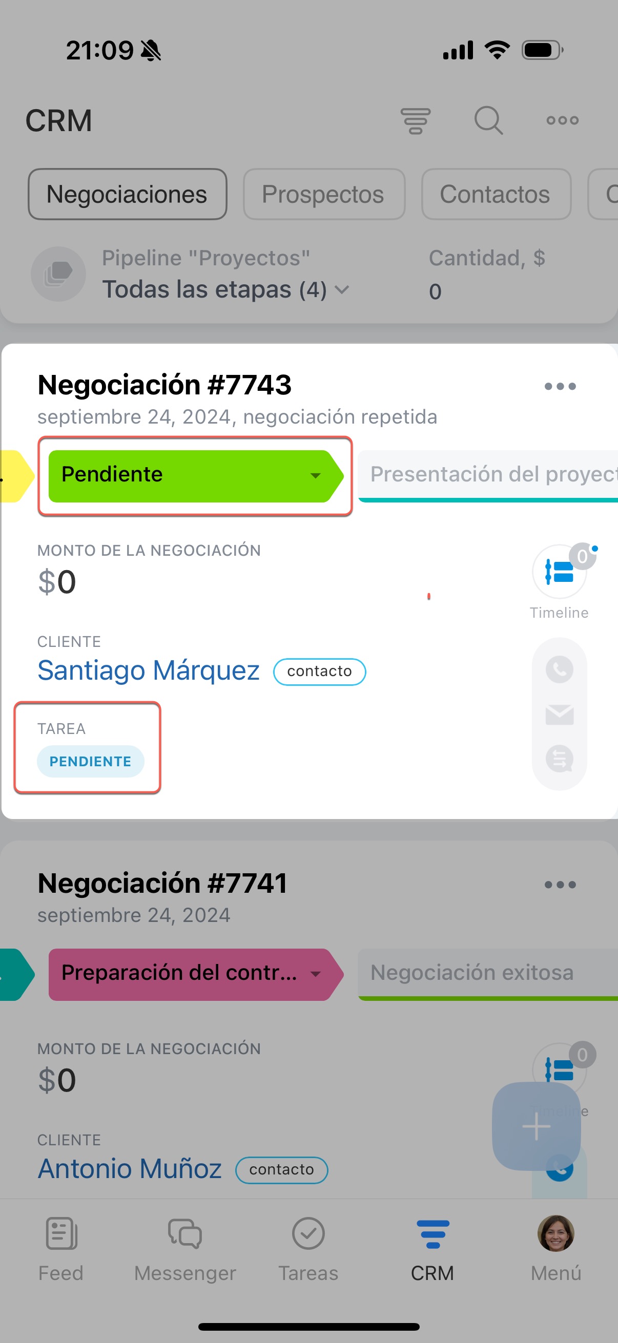 La tarea creada aparecerá en el timeline de la negociación.