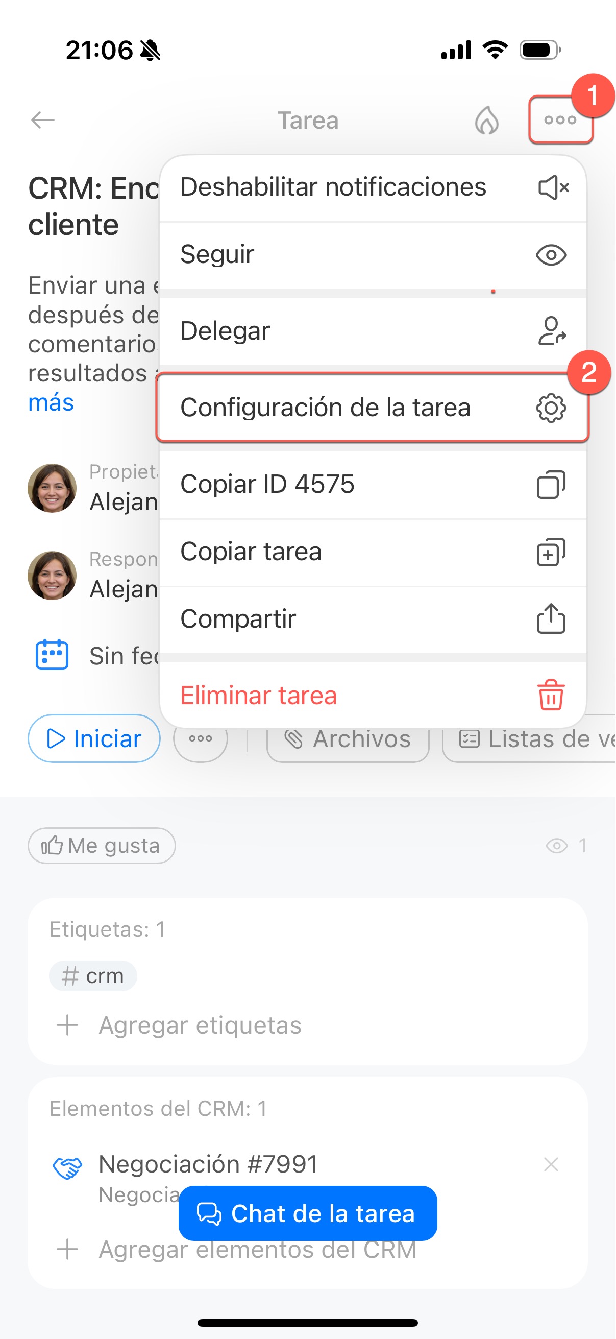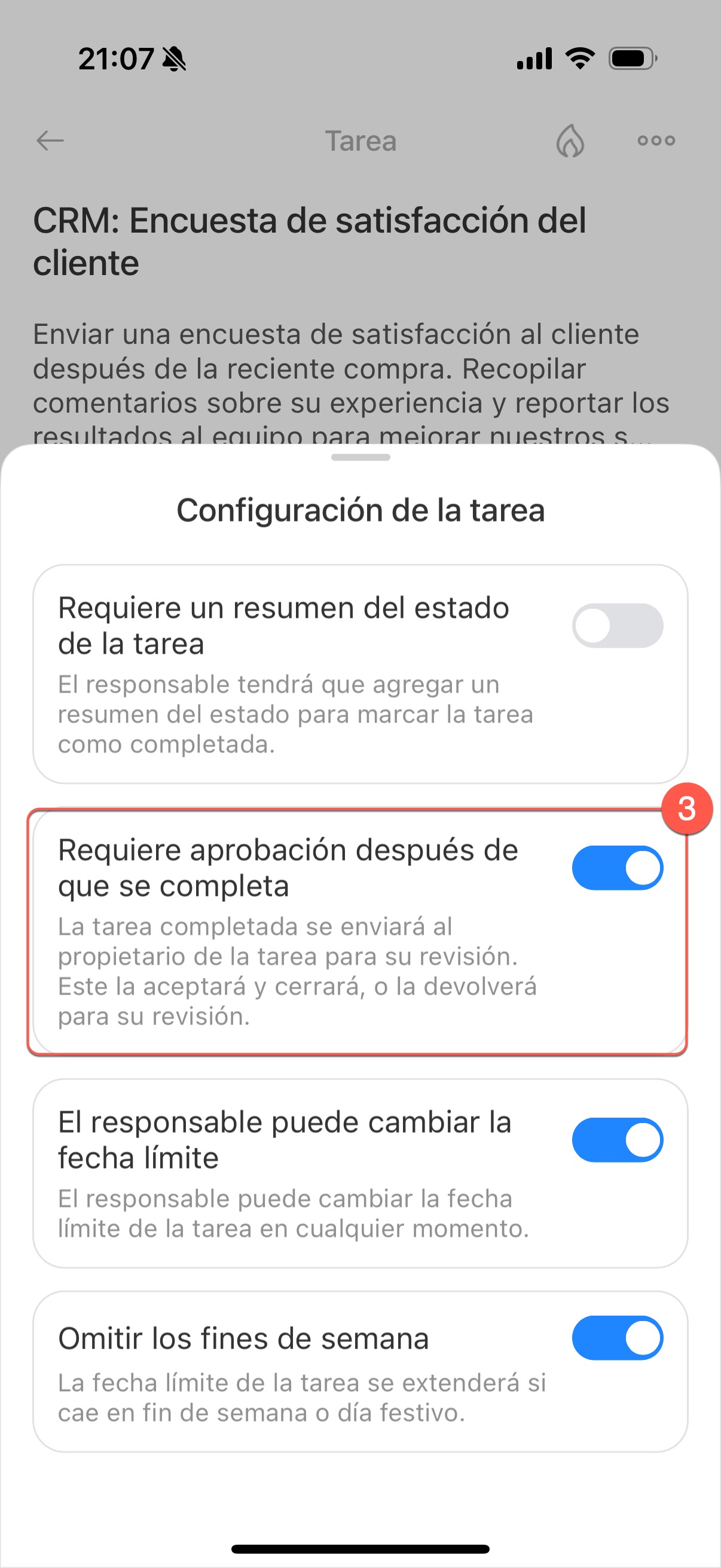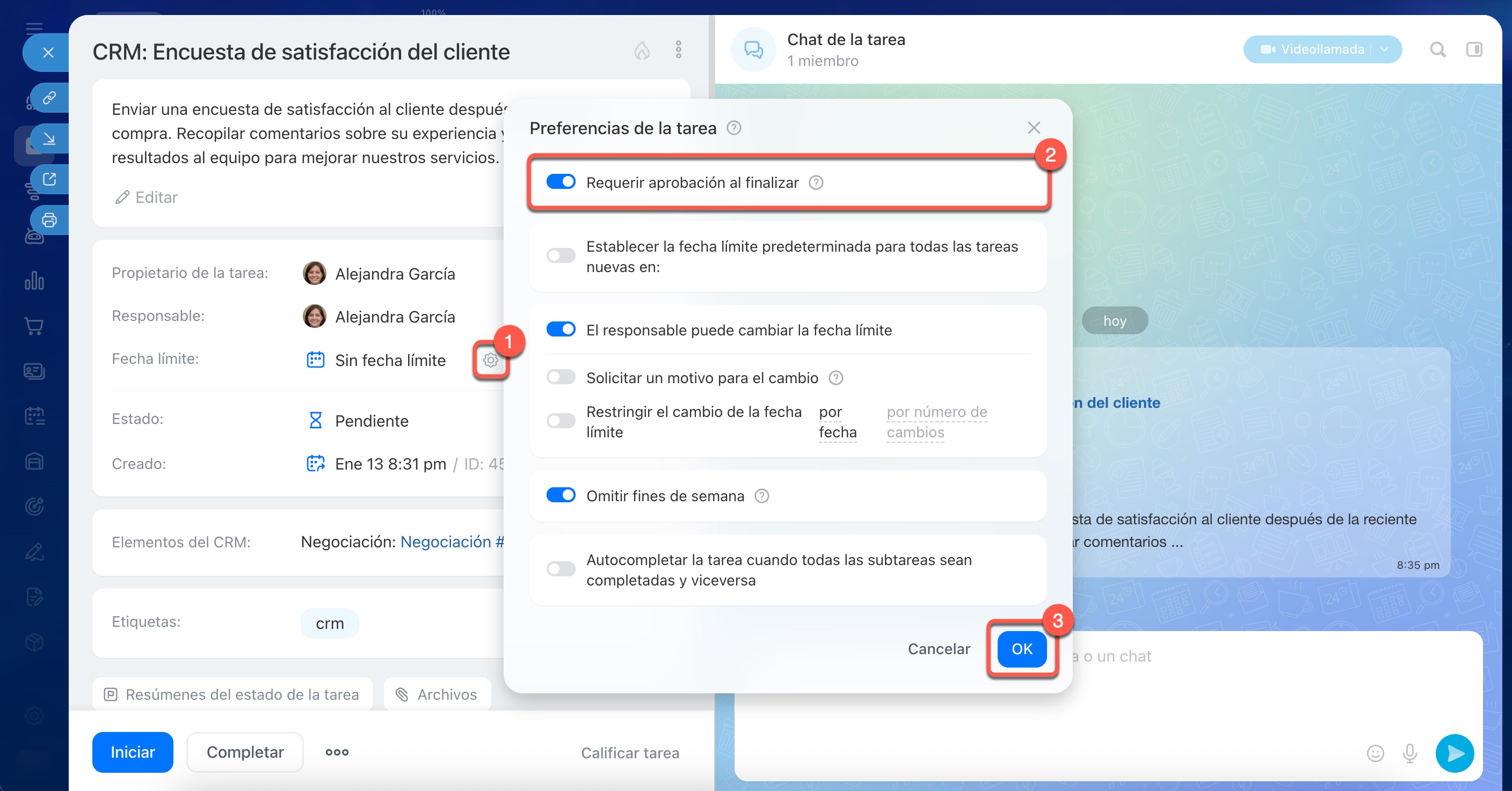 Revisa la tarea. Al crear o editar una tarea, haz clic en Configuración (⚙️) junto a la fecha límite y habilita la opción Requerir aprobación al finalizar. Al cerrar la negociación, la tarea pasará al estado Revisión pendiente y se podrá localizar con el filtro En progreso.