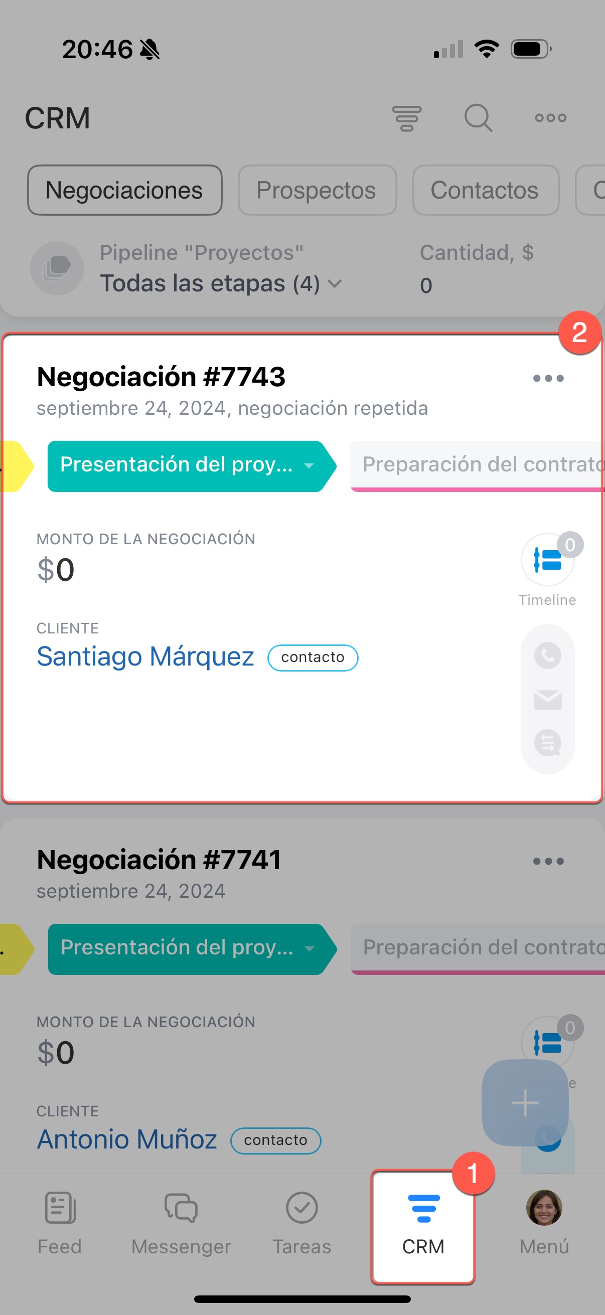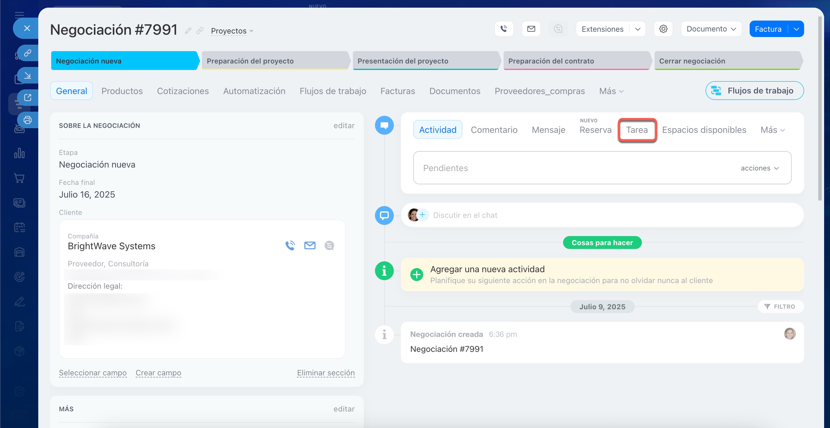 Ve a la sección de CRM > Negociaciones y abre la ficha de la negociación deseada.