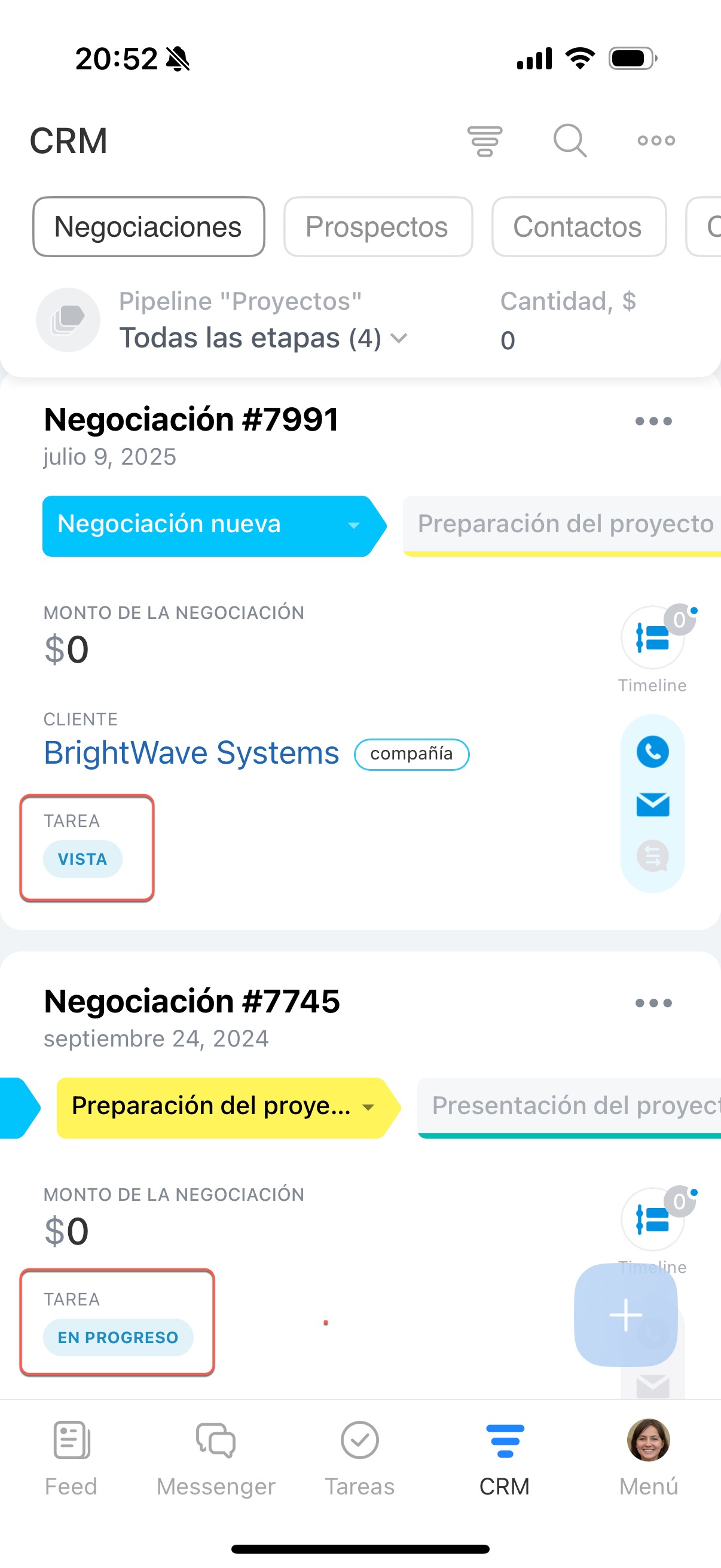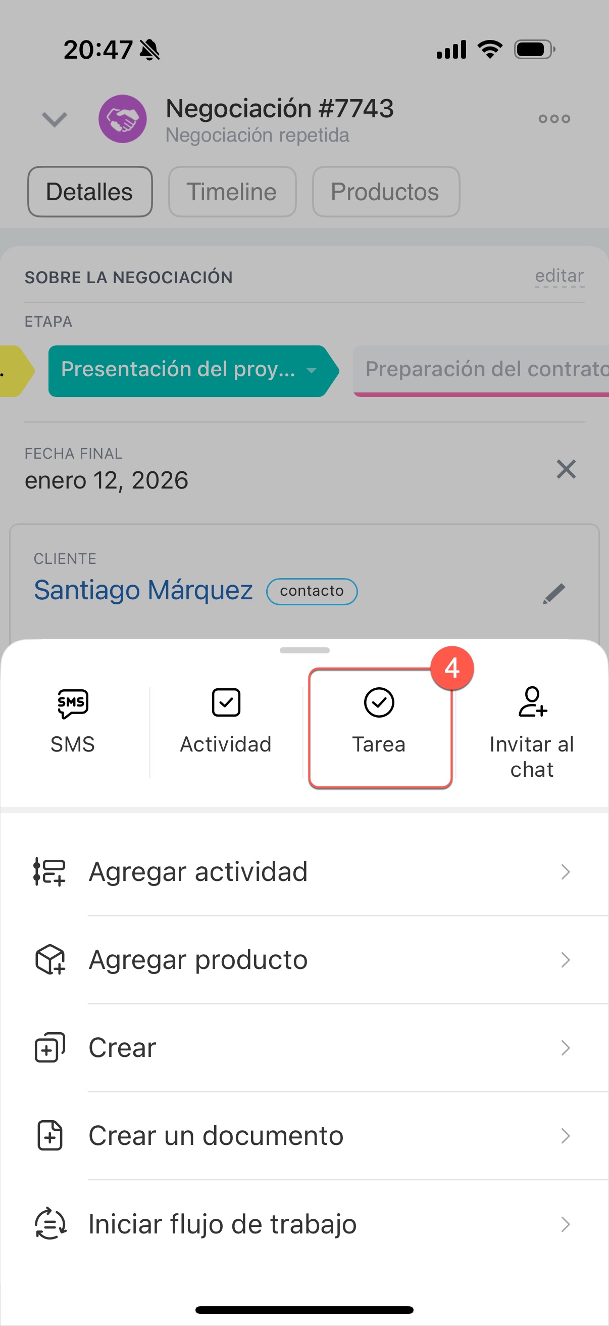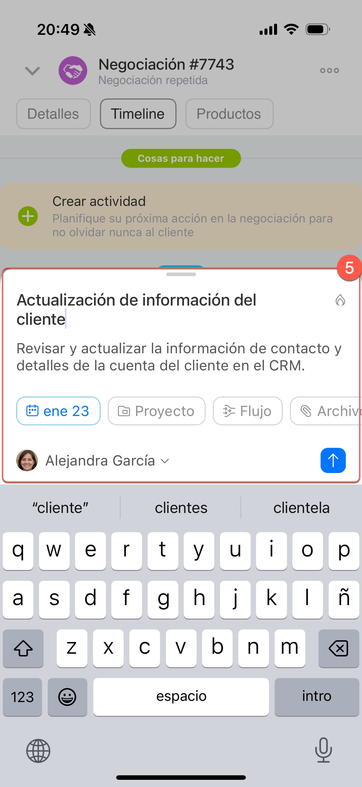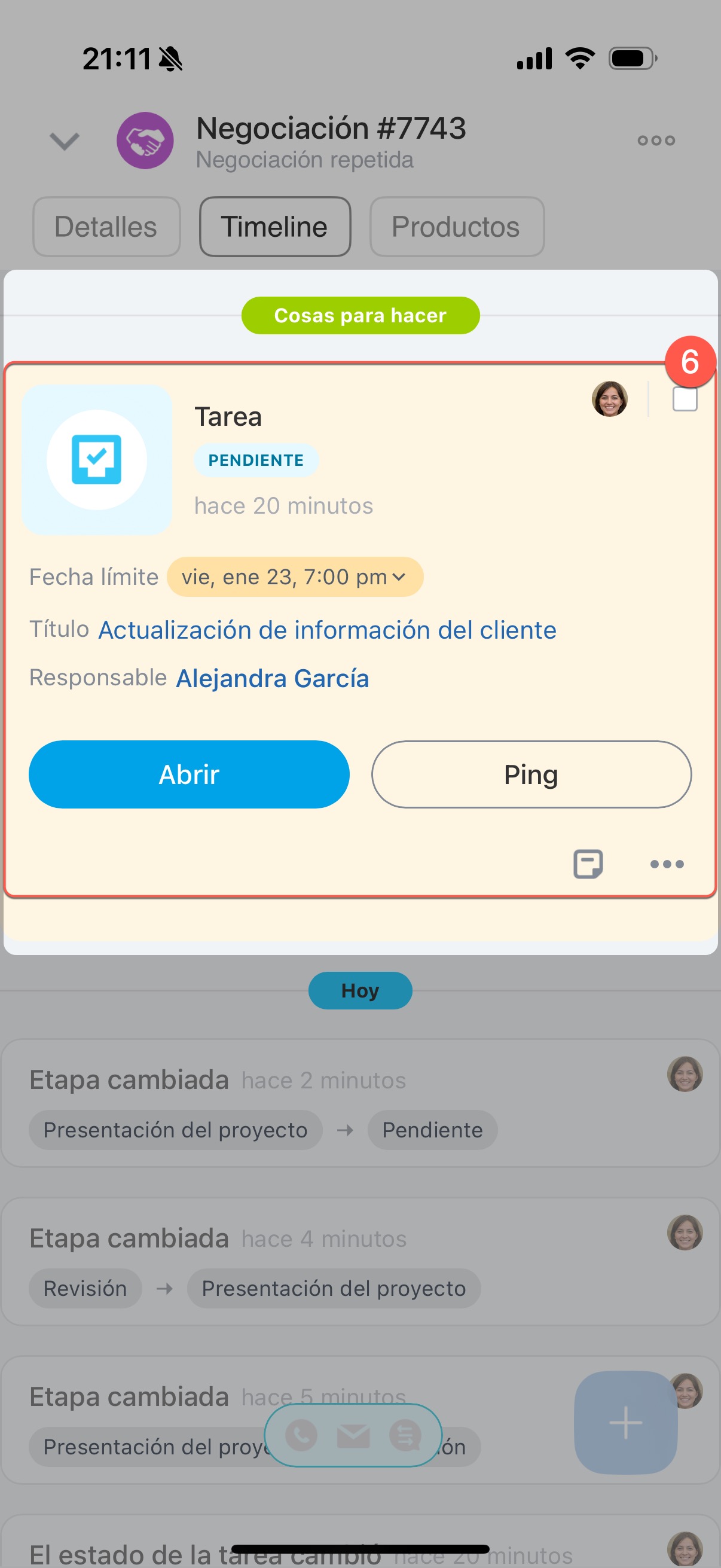 6. La nueva tarea aparecerá en el timeline de la negociación.