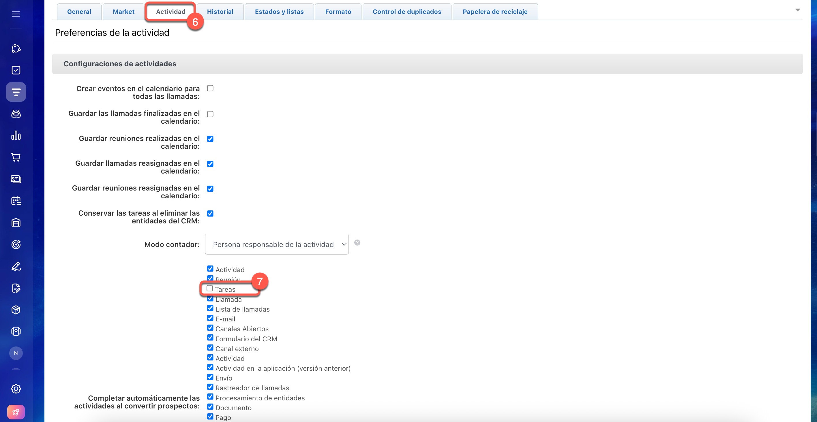 6-7. Abre la pestaña Actividad. Deshabilita la opción Tareas en el campo Completar automáticamente las actividades al convertir prospectos.