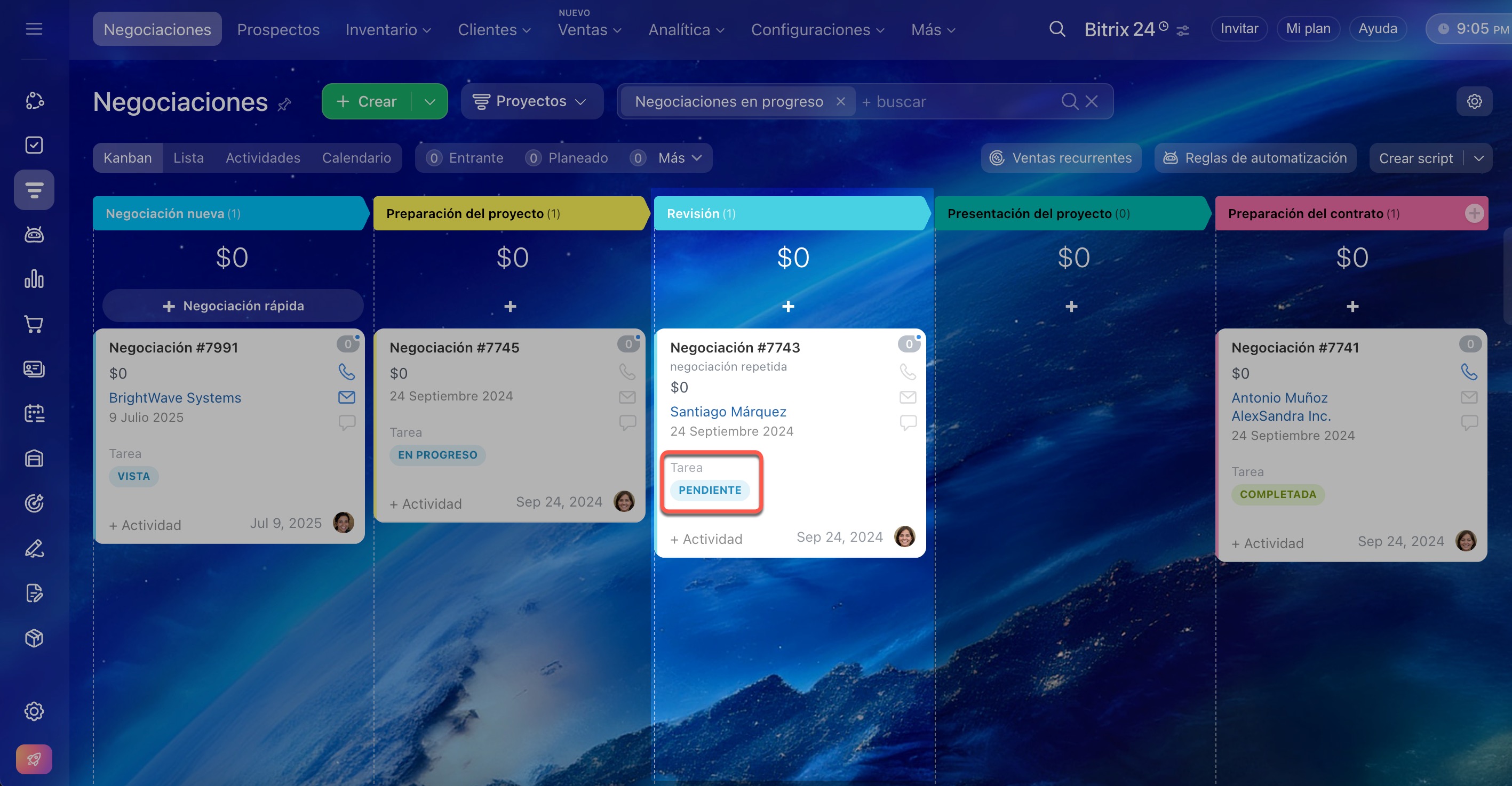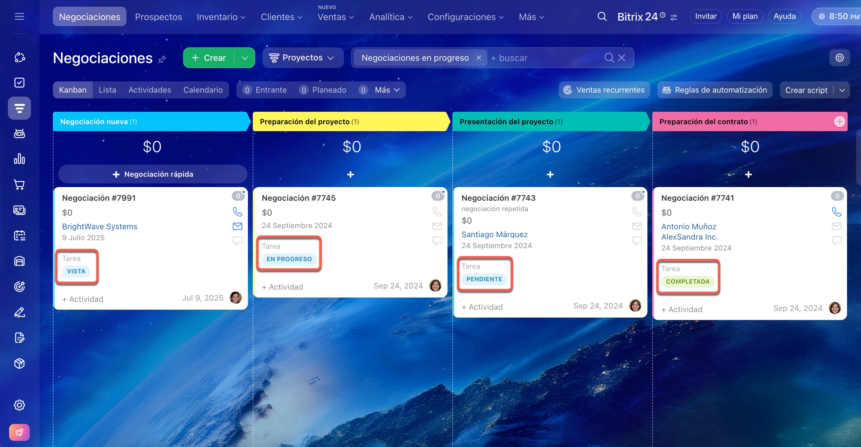 En caso de múltiples tareas en una negociación, Kanban mostrará el estado más reciente.