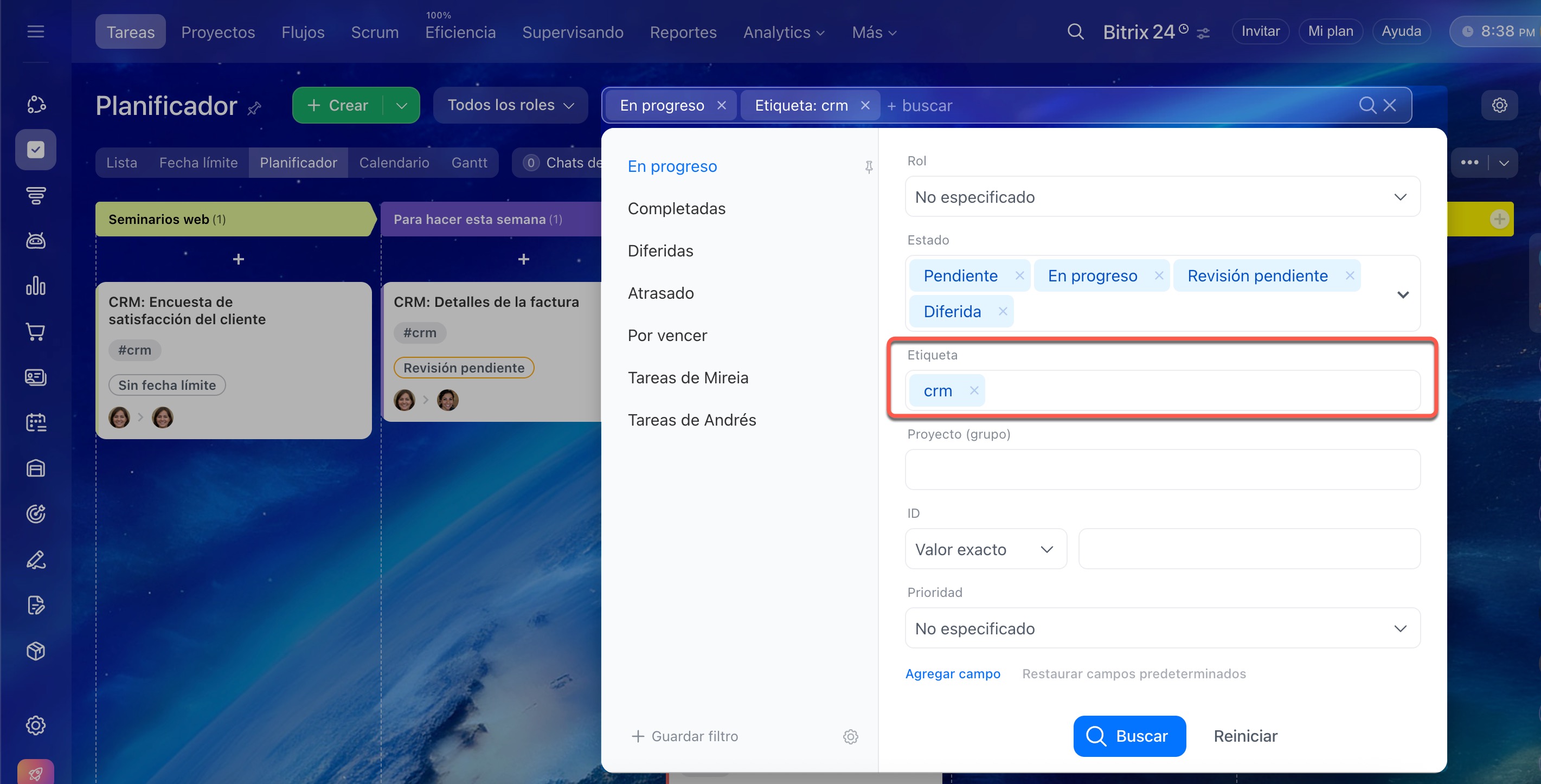 Las tareas creadas en CRM también se pueden encontrar en la sección de Tareas y proyectos. Para ello, configura el filtro en el campo Etiqueta > CRM.