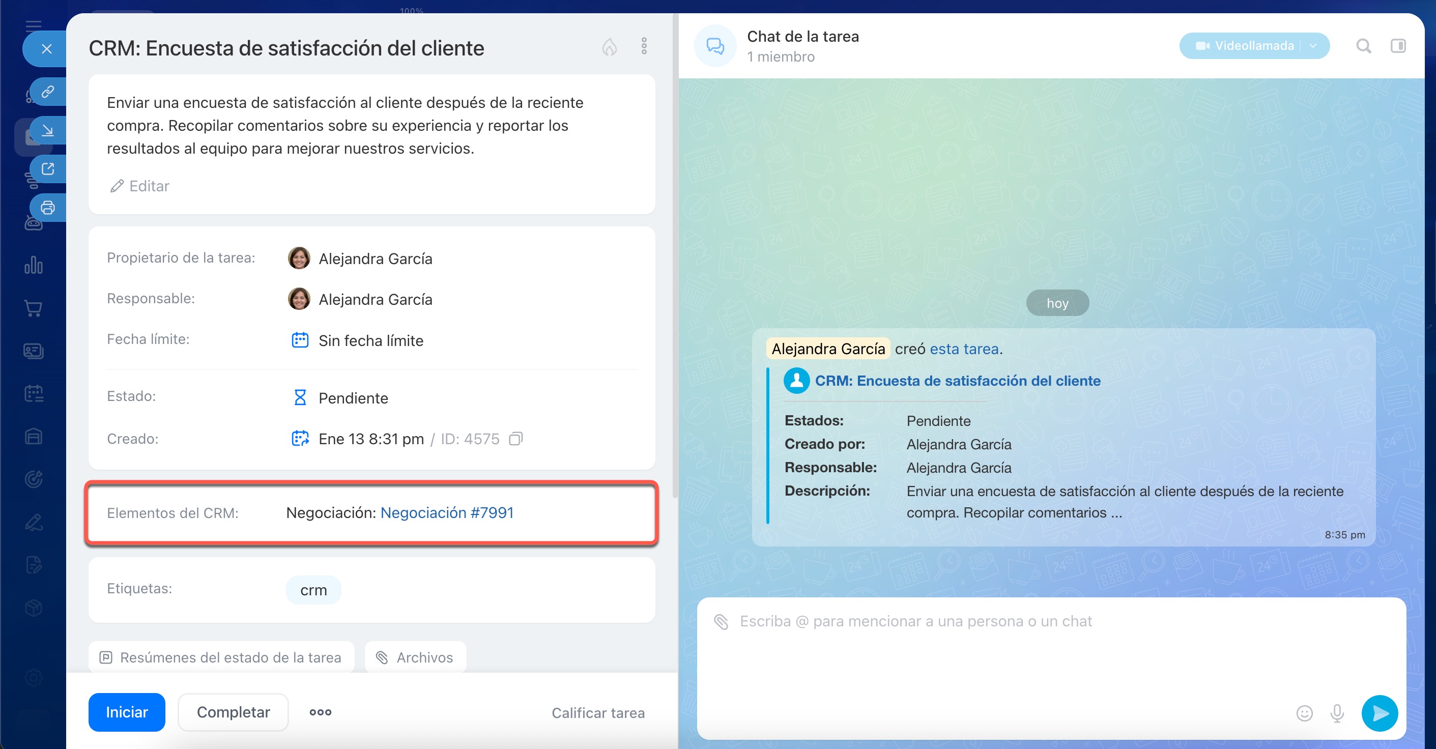 En Bitrix24, puedes crear tareas vinculadas a clientes directamente desde la ficha de CRM. Por ejemplo, puedes elaborar un contrato o enviar una propuesta comercial para una negociación. Los estados de las tareas te permitirán monitorear su progreso.