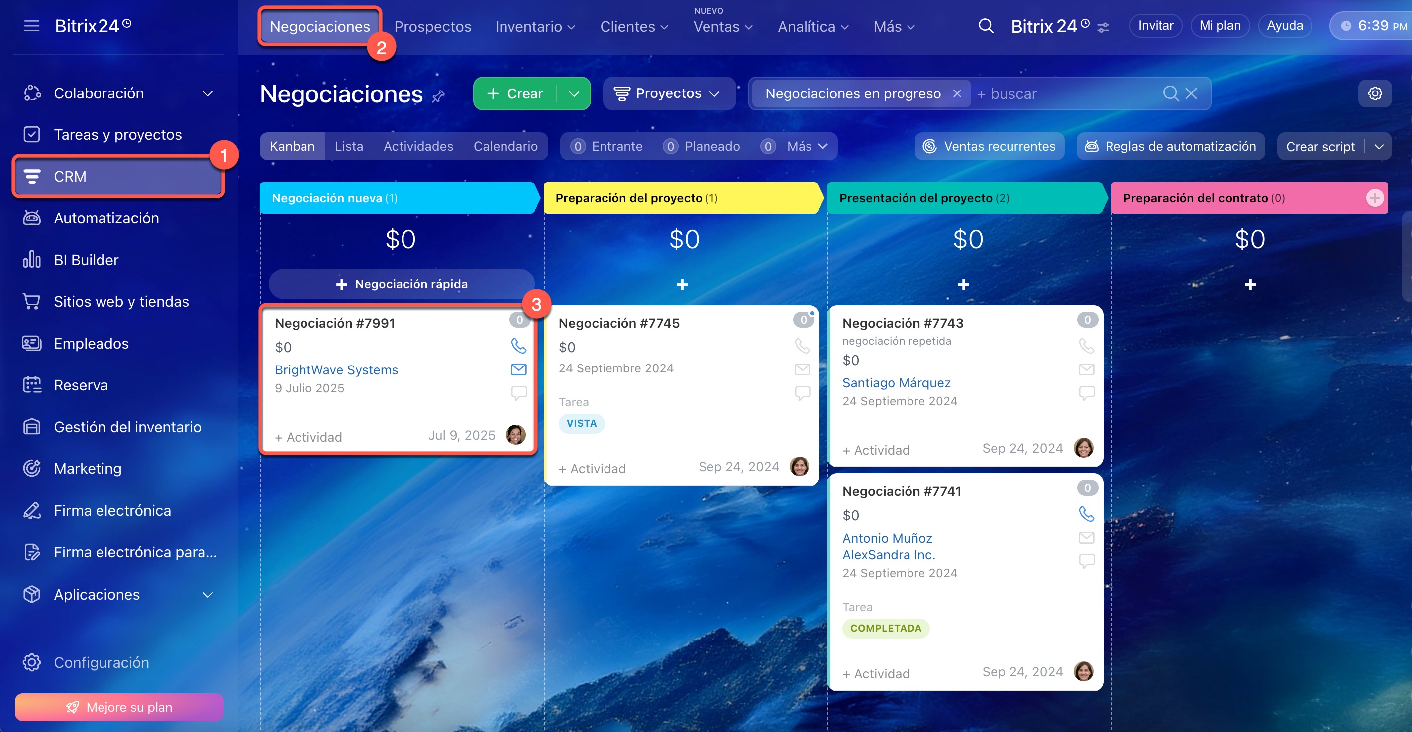 Puedes crear una tarea desde la ficha de CRM, ya sea en tu computadora o en la aplicación móvil de Bitrix24. A continuación, te mostramos cómo hacerlo utilizando como ejemplo la ficha de una negociación.