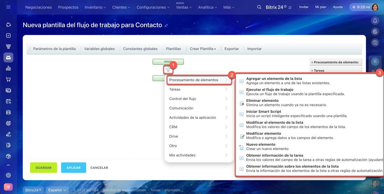 DEAL_{=Document: ID}ejecutará el flujo de trabajo para la negociación,LEAD_{=Document: LEAD_ID}ejecutará el flujo de trabajo para el prospecto vinculado,CONTACT_{=Document: CONTACT_ID}ejecutará el flujo de trabajo para el contacto vinculado,COMPANY_{=Document: COMPANY_ID}ejecutará el flujo de trabajo para la compañía vinculada.