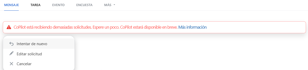 CoPilot puede procesar un máximo de 600 solicitudes por hora entre todos los usuarios de tu Bitrix24. Este límite asegura el funcionamiento estable de Bitrix24 y se aplica a todos los planes, tanto en la versión en la nube como en la versión en premisa.