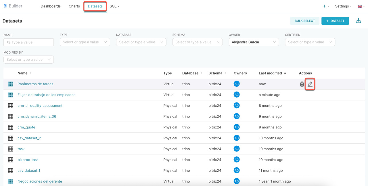 Si ya tienes un informe existente, puedes editar el conjunto de datos y añadir el parámetro necesario. Para ello, abre la pestaña Datasets, selecciona el conjunto de datos y haz clic en Editar.