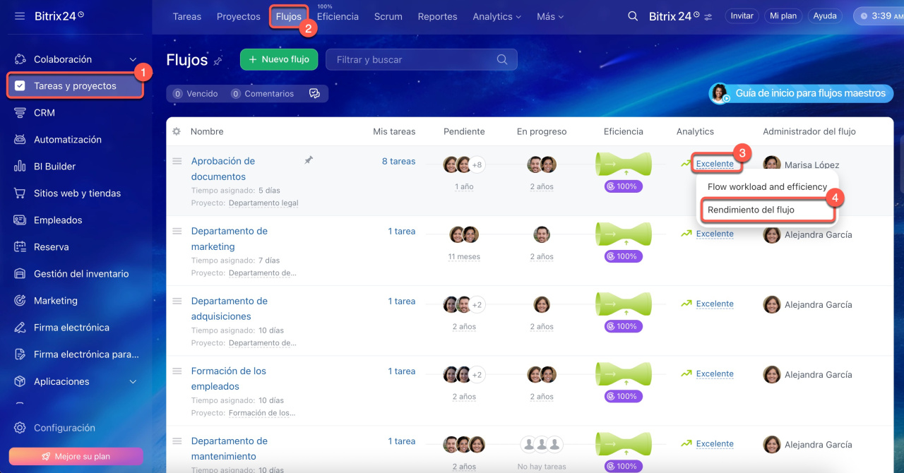 Flujos de tareas. Accede a Tareas y proyectos > Flujos. En la columna Analítica (Analytics), haz clic en el indicador del flujo y abre el informe.