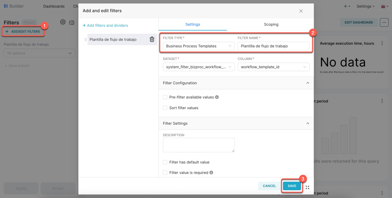 En el BI Builder puedes utilizar filtros basados en parámetros como los flujos de tareas y las plantillas de flujos de trabajo. Estos filtros te ayudan a enfocar el análisis en datos relevantes, como los de un solo flujo o plantilla de proceso.