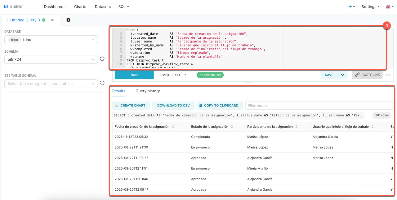 4. Escribe la consulta SQL y haz clic en Run. Incluye una plantilla Jinja en la consulta para que el filtro funcione correctamente. Por ejemplo, si abres el informe desde el acta de un flujo de trabajo, Jinja insertará su identificador y el informe mostrará solo los datos de ese proceso. Si abres el informe de forma independiente, el filtro no recibirá el identificador y mostrará todos los datos.