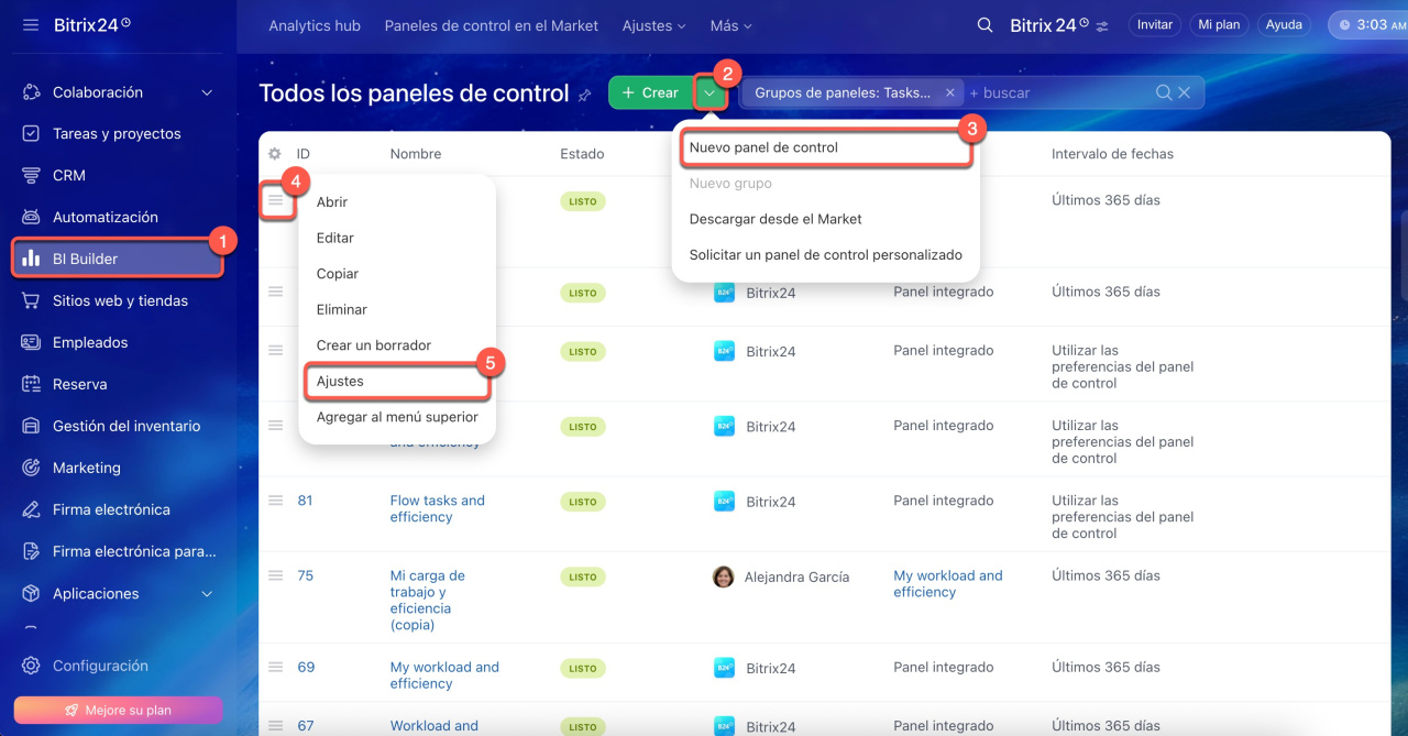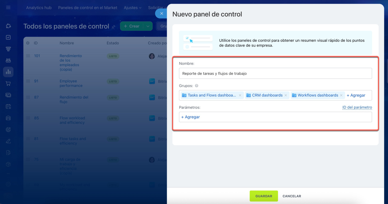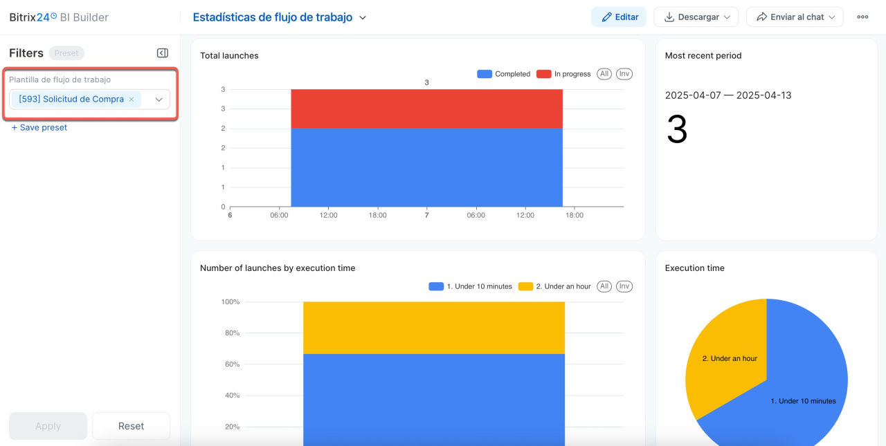 - Añade los filtros, abre el informe en Bitrix24 y comprueba que solo muestre los datos del flujo o proceso que hayas elegido.
