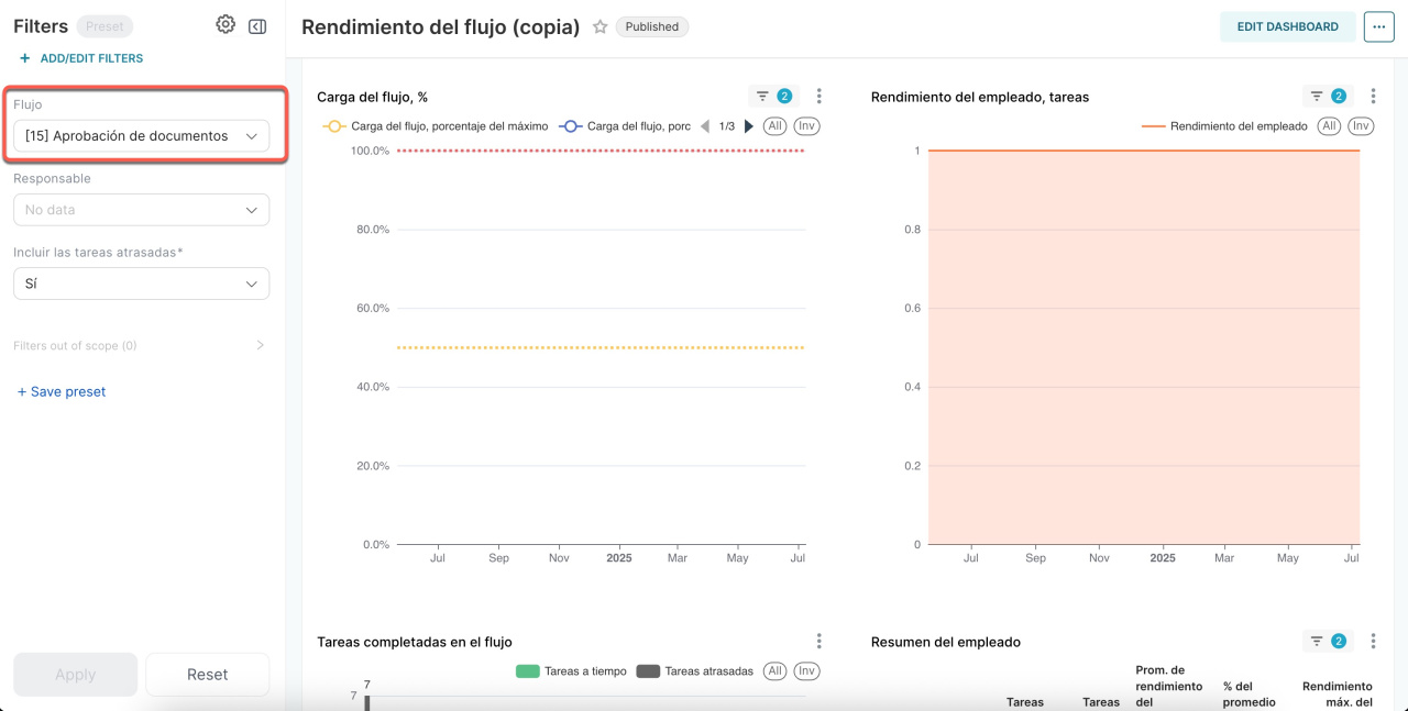 Los filtros funcionan con los parámetros del informe y se aplican automáticamente en función del origen desde donde se abre. Por ejemplo, si el informe se abre desde el flujo "Departamento legal", el filtro se aplicará automáticamente y mostrará únicamente las tareas de ese equipo.