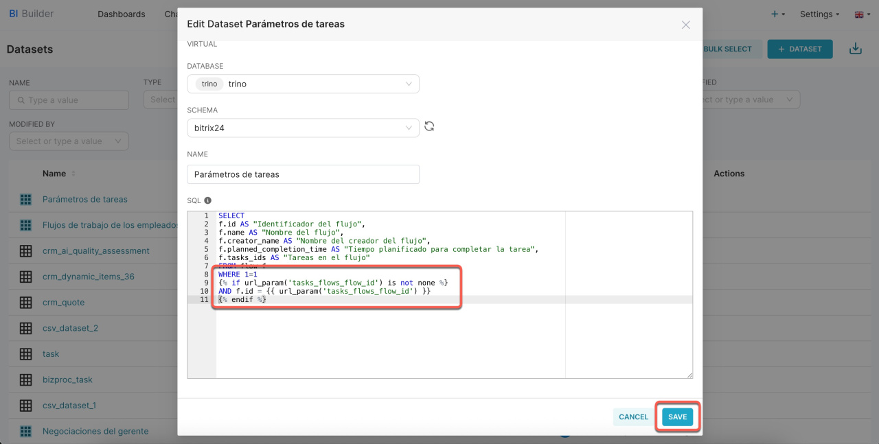 Se utiliza una plantilla Jinja que verifica si el informe incluye el parámetro tasks_flows_flow_id. Si el informe se abre desde un flujo, Jinja inserta su identificador y muestra solo los datos de ese flujo. Si se abre directamente en el BI Builder, el parámetro no se transmite y se muestran todos los datos.