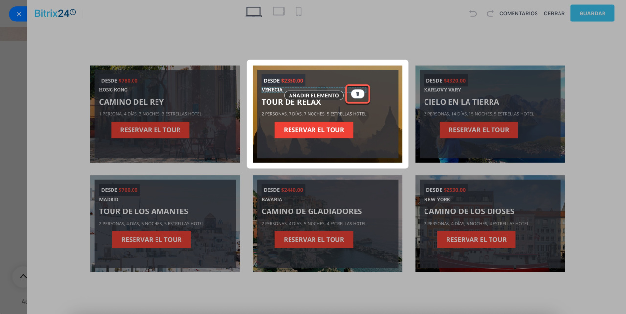 Eliminar elementos innecesarios. Para quitar cualquier elemento que no necesites, haz clic en el icono de papelera que aparece al pasar el cursor sobre él.