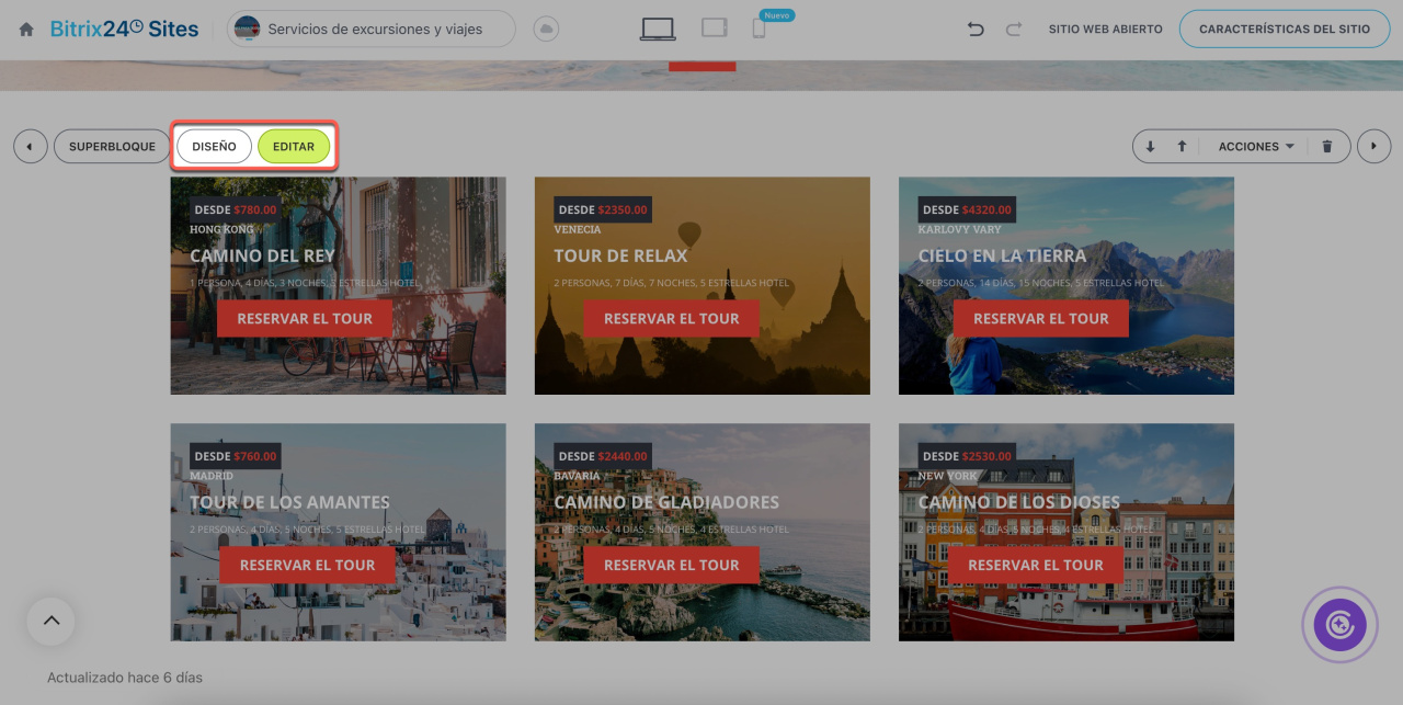 Una vez configurado el superbloque, no olvides hacer clic en Guardar para aplicar los cambios. Luego, puedes seguir ajustando el diseño con los botones Editar y Diseño disponibles en el bloque.