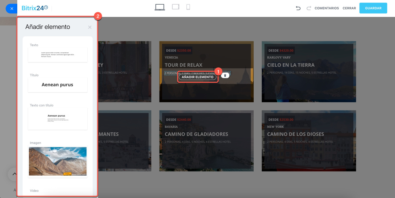 Añadir elementos. Puedes enriquecer cualquier bloque con elementos adicionales como textos, imágenes, videos, botones o iconos.