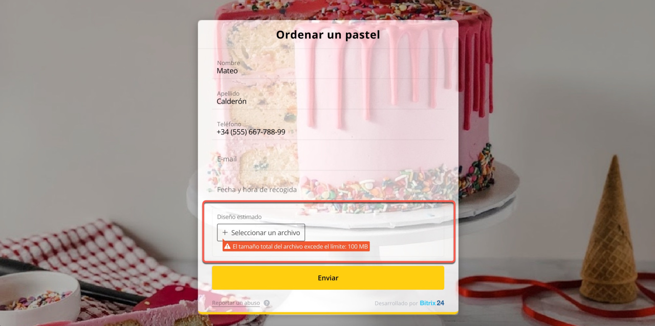 Límite por campo. Por defecto, cada campo acepta archivos de hasta 1000 MB, pero puedes ajustar este valor. Si un cliente intenta subir un archivo más grande, el sistema mostrará un mensaje de error y no permitirá la carga.