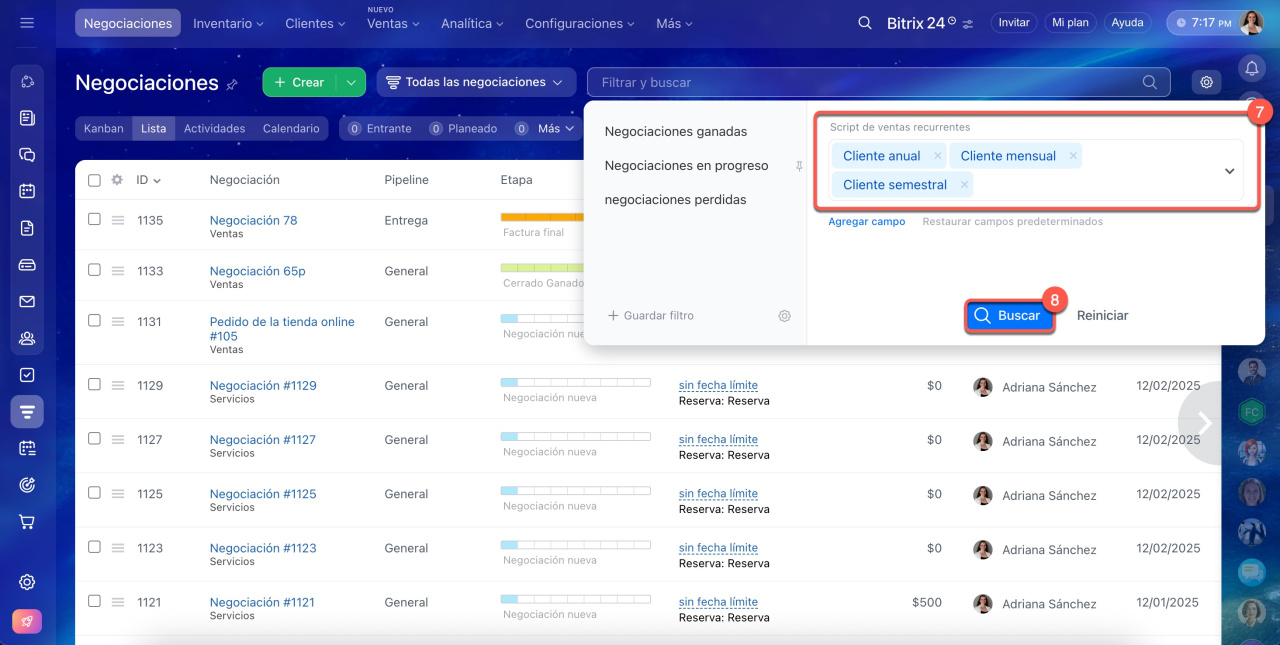 Para localizar todas las negociaciones creadas automáticamente por ventas recurrentes con IA, utiliza el filtro Script de ventas recurrentes.