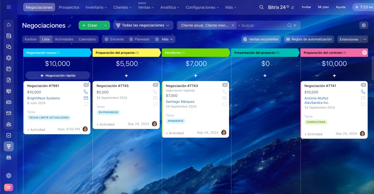 - Optimiza tus resultados: completa minuciosamente las fichas de clientes, configura tus pipelines de negociaciones, utiliza la transcripción de llamadas con IA, mantén actualizado tu catálogo y registra sistemáticamente los acuerdos en el CRM.