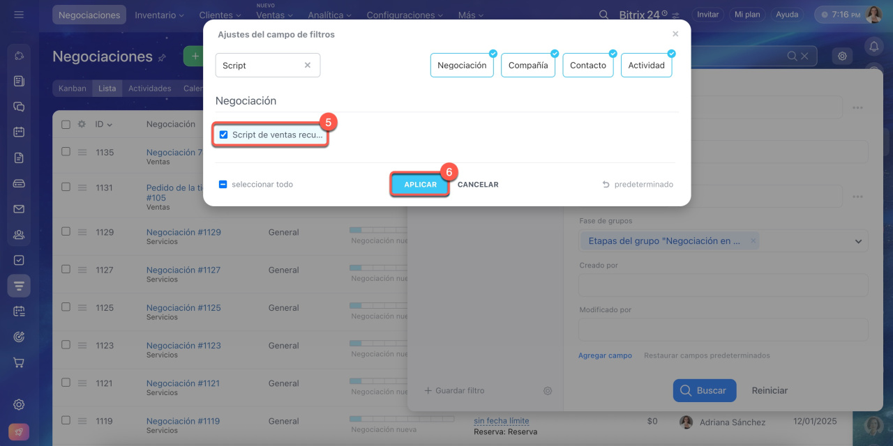 El CRM mostrará todas las negociaciones creadas a partir de los scripts de ventas recurrentes seleccionados.