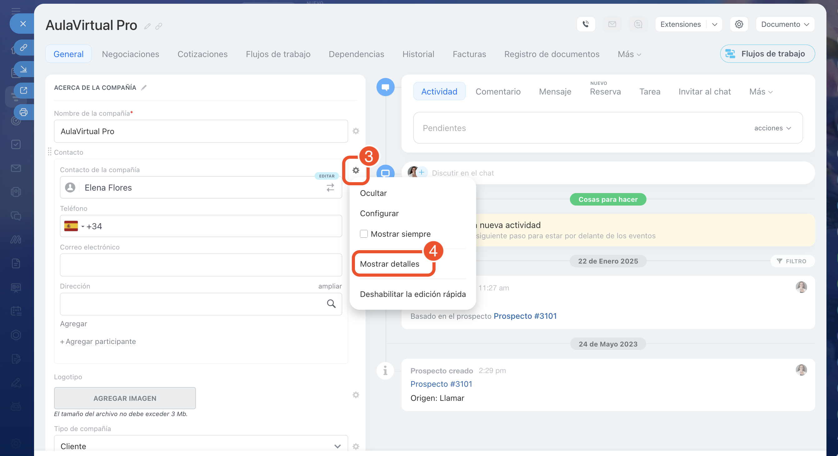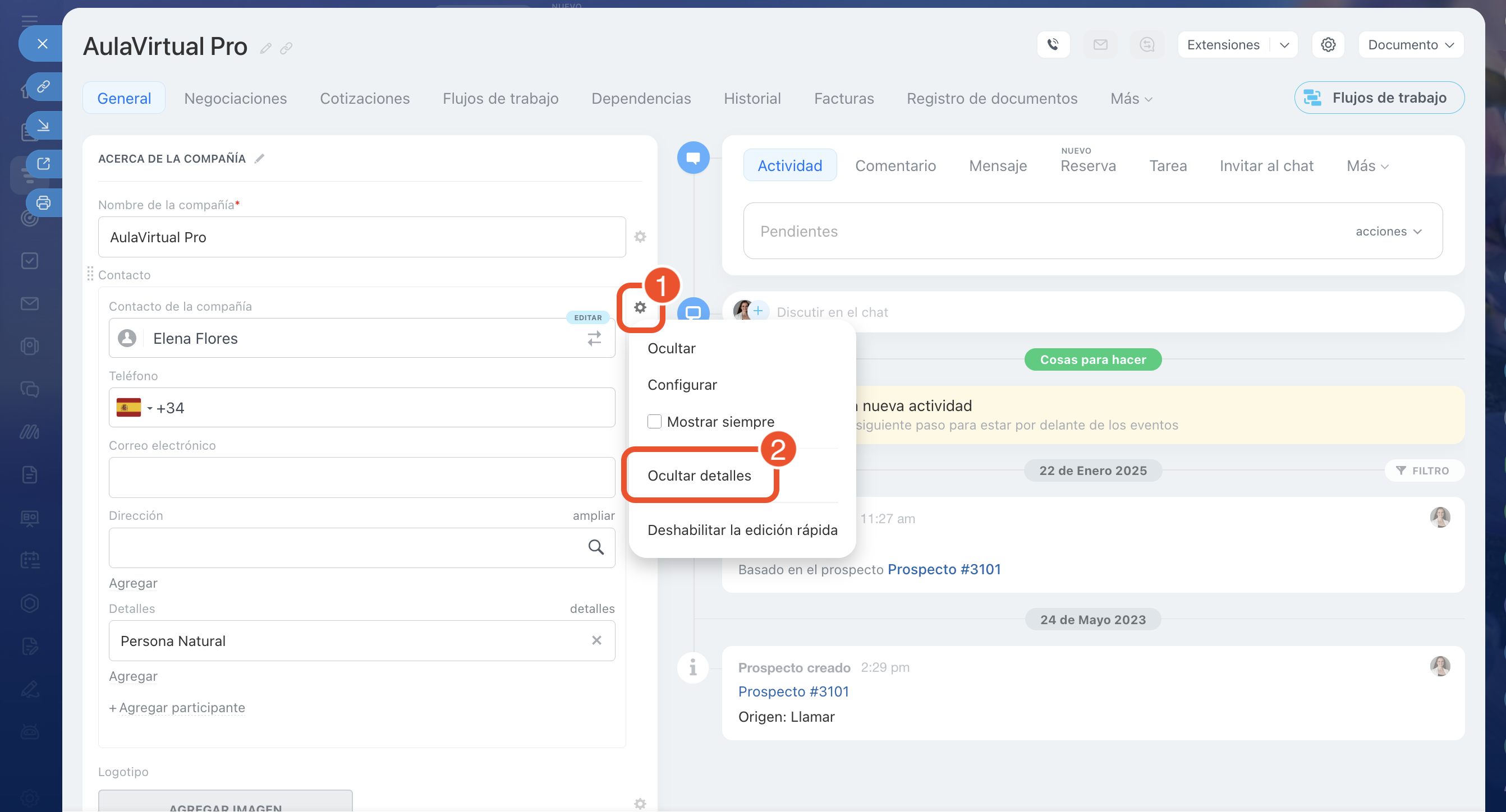Ocultar los detalles del contacto. Si en la ficha de la compañía los detalles del contacto vinculado dificultan el trabajo con la información principal, se pueden ocultar temporalmente.