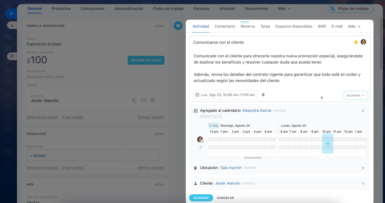 Planificar reuniones y actividades. Crea actividades relacionadas con clientes directamente desde la ficha: especifica cliente, lugar, fecha y hora, agrega colegas y selecciona una sala de reuniones. Esto asegura que no se olviden compromisos y que todas las actividades estén bajo control.